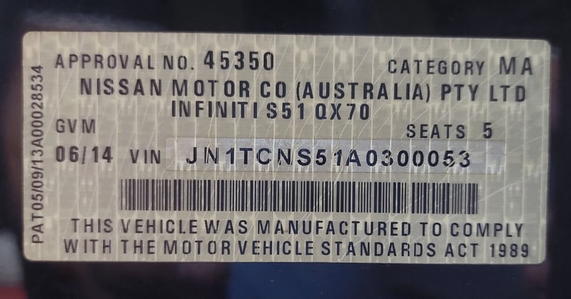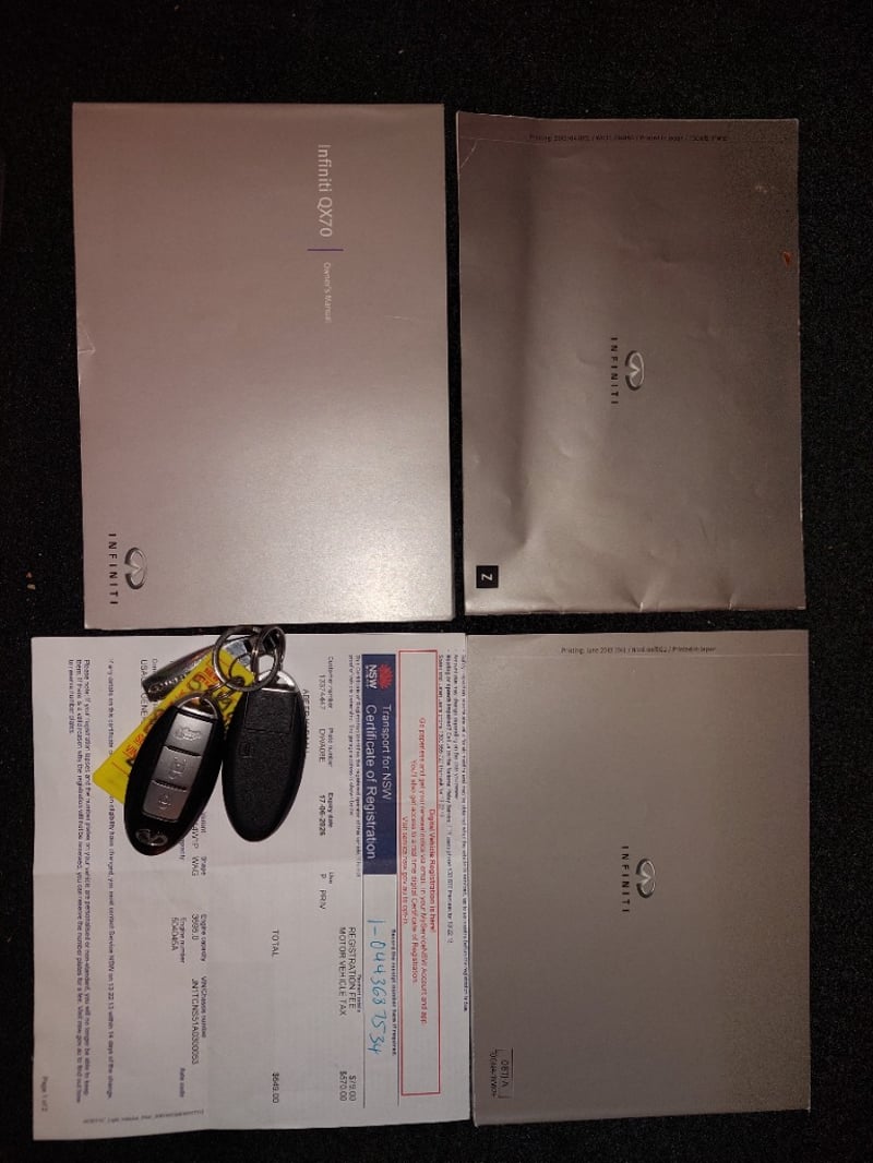 2014 Infiniti QX70 Year: 2014 Make: Infiniti Model: QX70 Body: 4-Door SUV Drive Type: All wheel drive Odometer: Indicating 117,991 Kilometers Engine: 3.7 V6 Petrol Transmission: Automatic Colour: Black Seats: 5 Description/extras: Air Conditioning, Power windows, SRS, Power seats, Leather interior, Alloy wheels, Sunroof, Reverse camera, Central locking, CD player. 2x Keys & Books. Price Guide - $15,200 - $16,400 (Based on Unmodified Vehicle) VIN: JN1TCNS51A0300053 ENG No: 504045A (Key #47B Marple) Lloyds stock #581986+1 #PCV