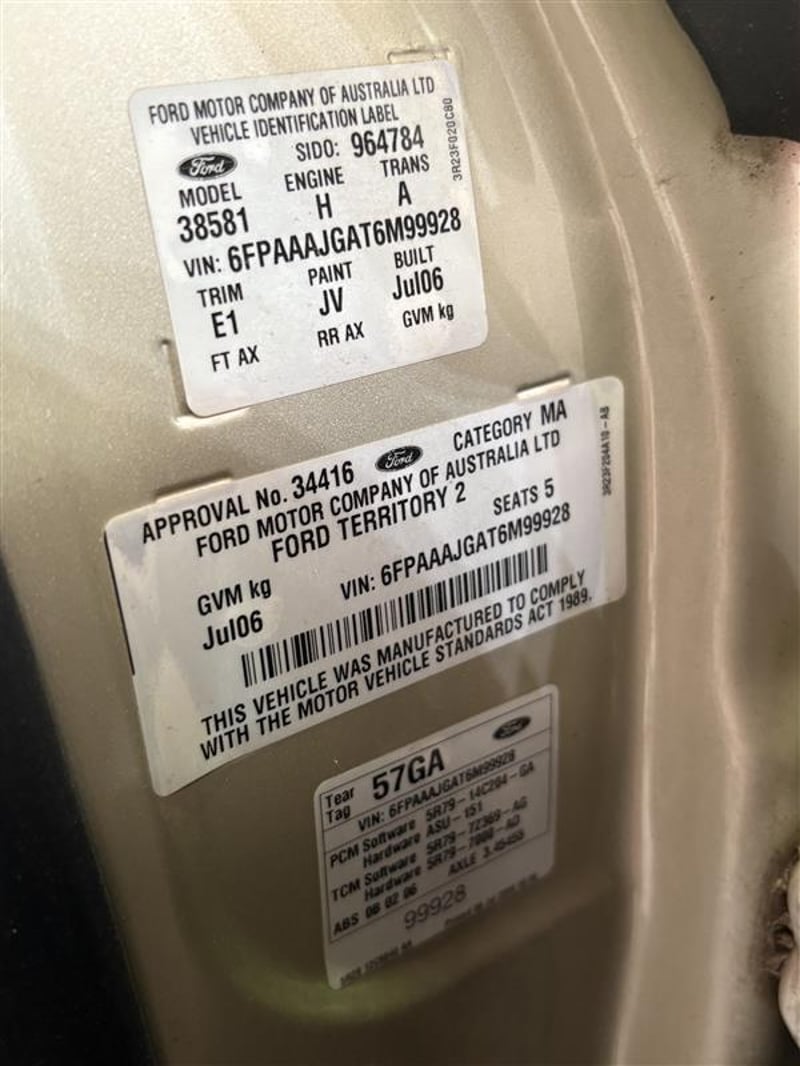 2006 Ford Territory SY TX Year: 2006 Make: Ford Model: Territory Series: SY Badge: TX Body: 5-Door SUV Drive Type: All wheel drive Odometer: Indicating 207,412 Kilometers Engine: 4.0 I6 Petrol Transmission: 6-Speed Automatic Colour: Gold Seats: 5 Description/extras: Owners manual. Paint Imperfections. A/C Requires Re-Gas. Windows only wind down when vehicle is OFF. Central locking does not work. Audio Head unit removed. VIN: 6FPAAAJGAT6M99928 ENG No: JGAT6M99928 (Key #A10) Lloyds stock #233435+1 Motor Dealer Licence # MD27332 #PCV