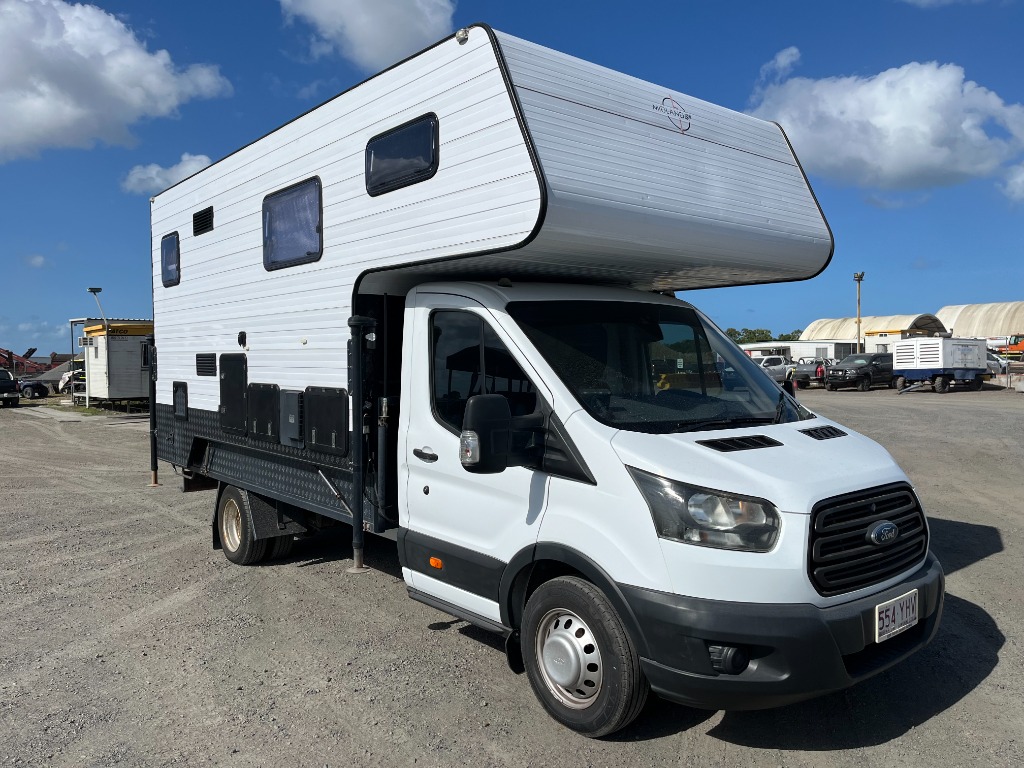 Description: Custom slide on/off camper on Ford Transit tray back. Ideal for towing. Spacious interior which features: queen size bed, 12/240V TV with DVD, AM/FM/CD player with 4 channel Fusion speakers, Air-conditioning, 190L Bushman 12/240V fridge freezer, 4 burner gas/ electric stove top and grill, microwave, large L shaped lounge with two position dining table, and plenty of cupboard storage.