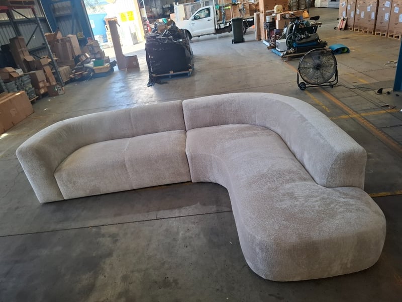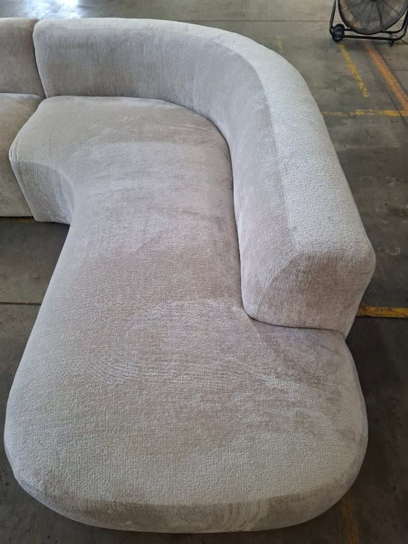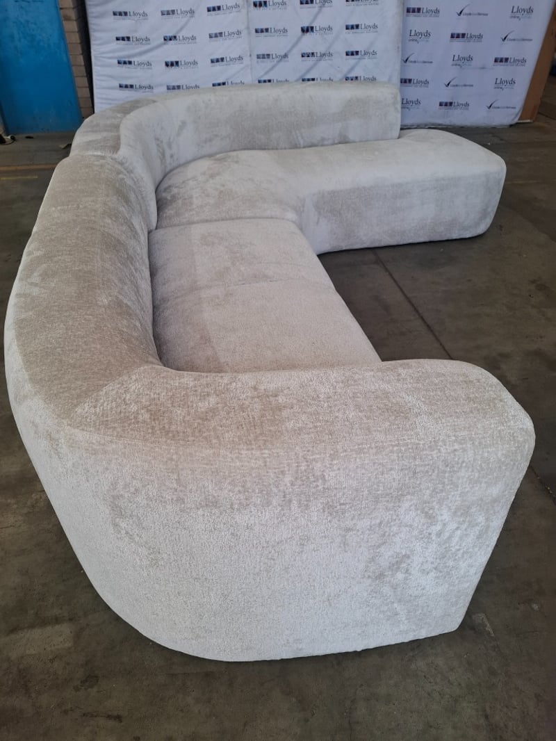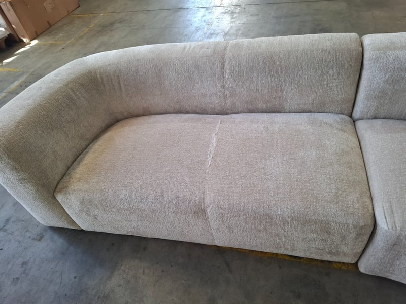 4.5 seater, Fabric upholstery, White couch Dimensions: 320cm W x 245cm D cm x 74cm HNOTE: SCUFFS AND MARKS, CLEANING REQUIRED, INSPECTIONS RECOMMEND