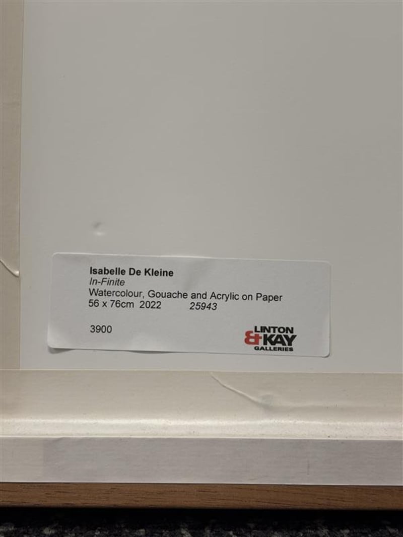 RRP$3,900 ISABELLE DE KLEINE (Contemporary Australian Artist) Original Watercolour, Gouache and Acrylic on Paper Title: In-Finite Image Size: 76cm x 56cm Frame Size: 91cm x 70cm x 4cm Signature Details: Hand Signed by the Artist Lower Right Gallery: Linton & Kay Galleries Catalogue Number: 25943 Year: 2022 Medium: Watercolour, Gouache and Acrylic on Paper Condition: Excellent – Refer to Images Provenance: Acquired from Linton & Kay Galleries. Isabelle De Kleine is a contemporary artist from Fremantle, Western Australia. Isabelle De Kleine is acclaimed for her expressive and fragmented figurative style. In-Finite continues her exploration of layered identity, introspection, and the tension between realism and abstraction.