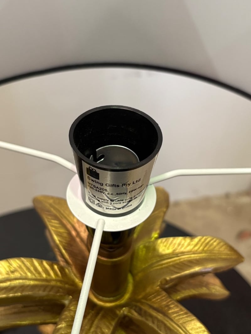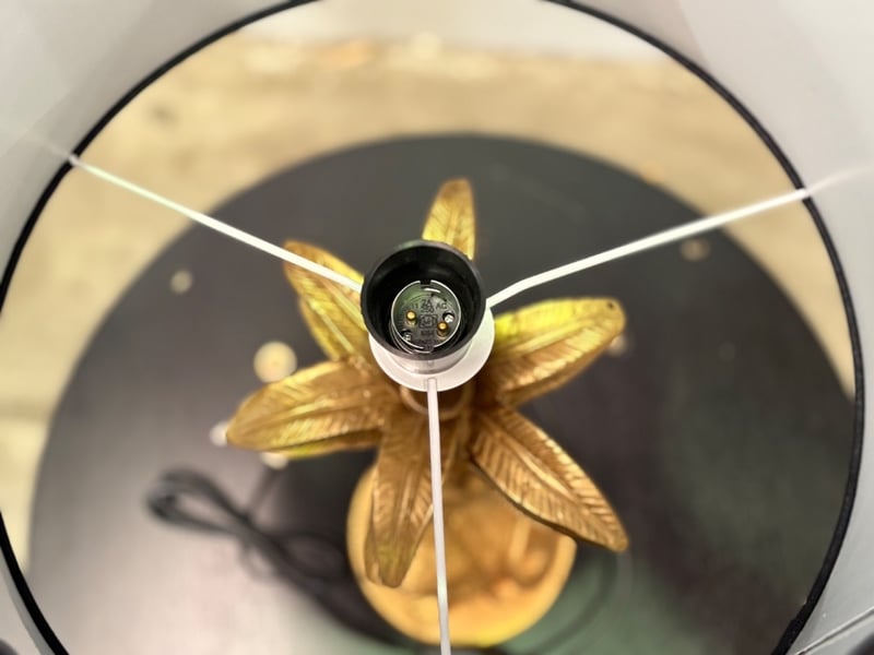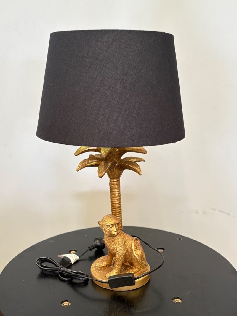 Gold Monkey Table Lamp with Black Shade Decorative gold-tone table lamp featuring a sculpted monkey sitting beneath a palm tree trunk base, paired with a classic black tapered lampshade. Includes black inline switch and power cord.