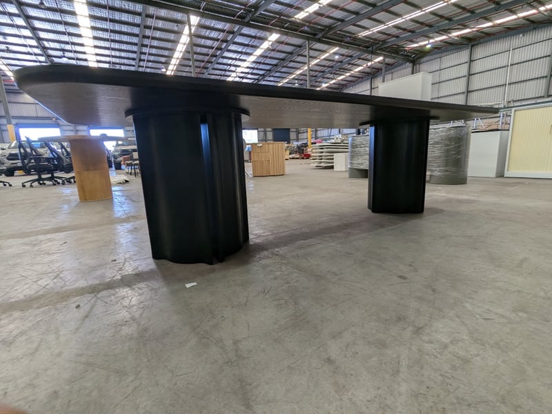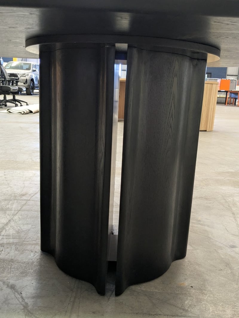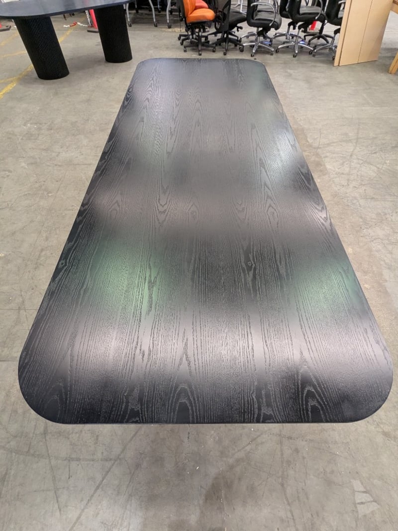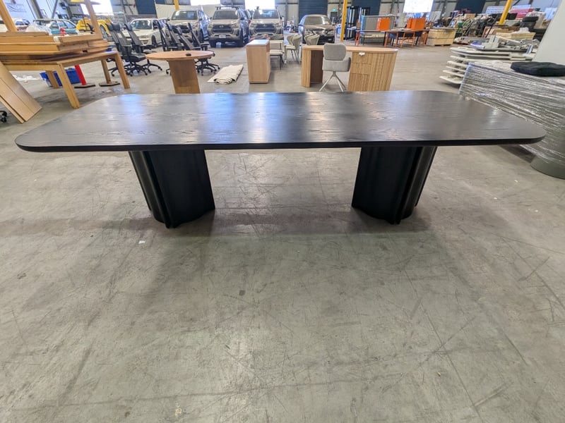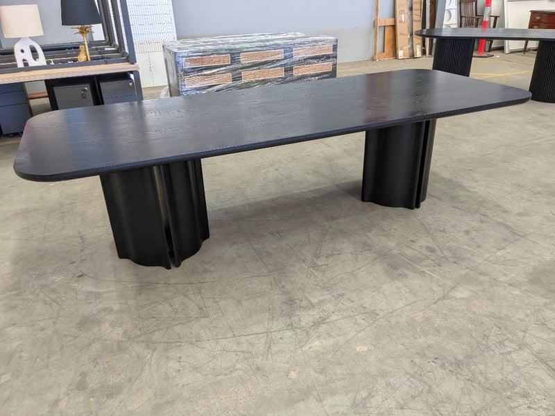 RRP $6,020 GlobeWest Leon Dining Table in Matt Black Oak Approx. Dimensions: (H) 75 cm x (W) 220 cm x (D) 100 cm Modern matt black-oak dining table with a strong architectural presence, sleek surface and substantial legs — a statement piece that balances minimalist design with bold texture and form.