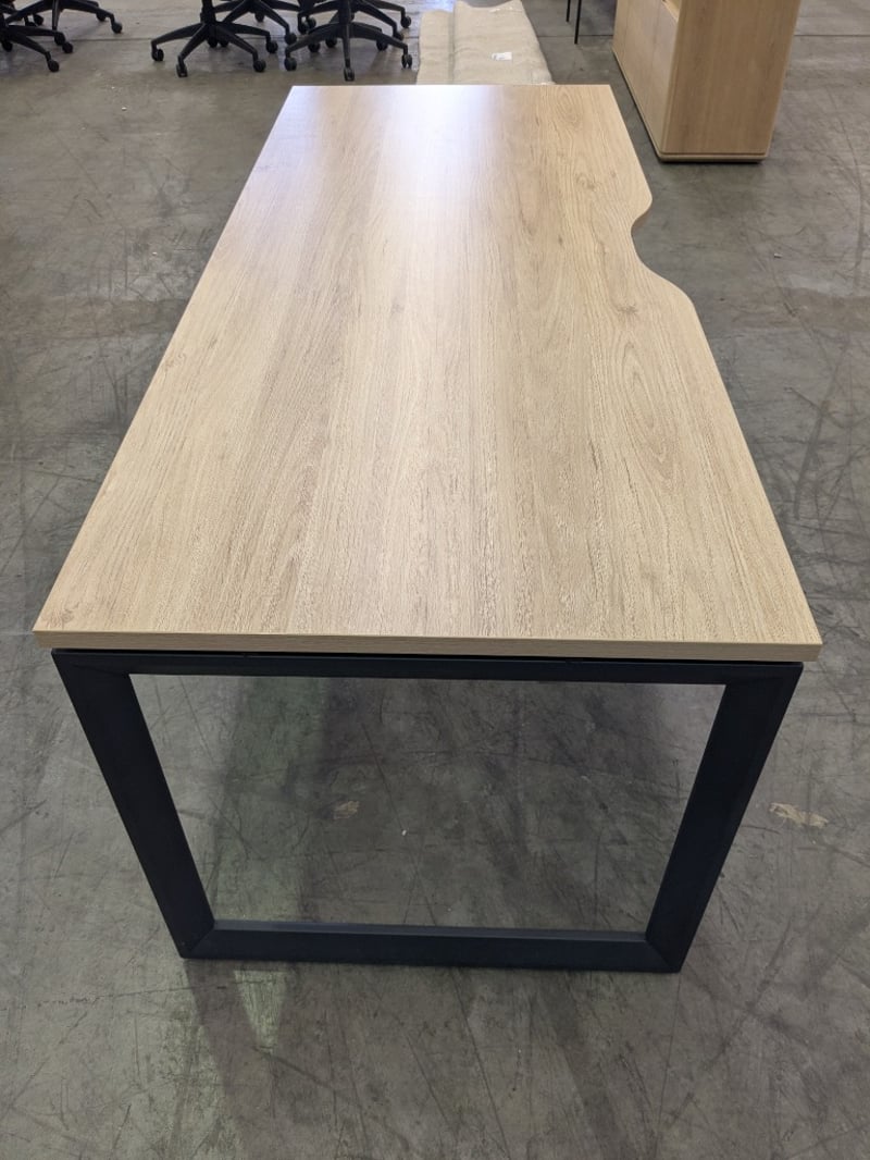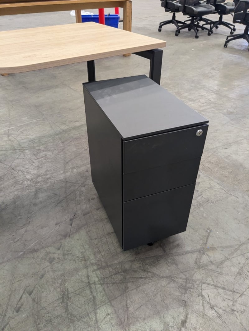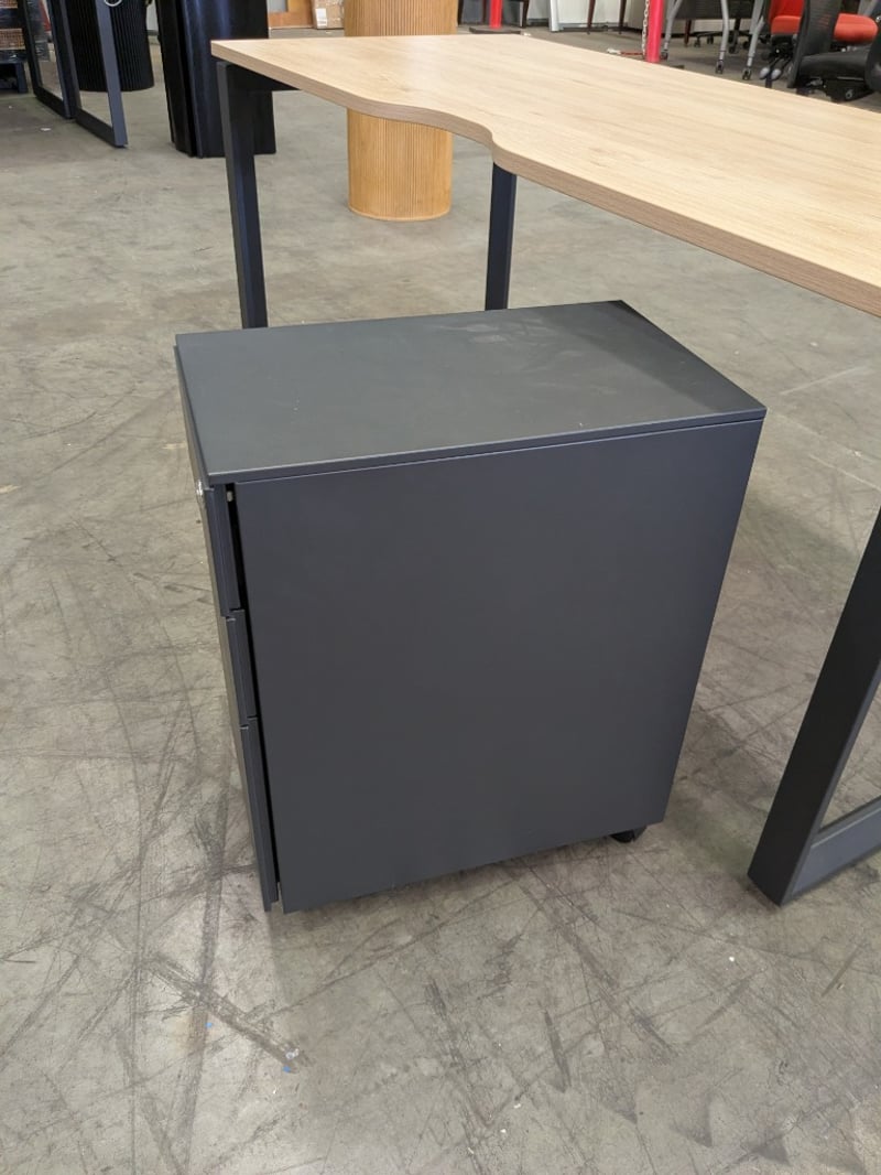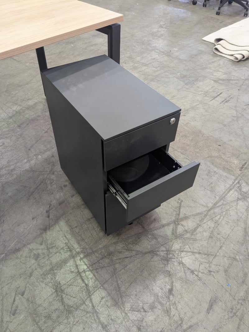 Office Desk, Beige Timber Top with Black Painted Metal Style Legs Accompanied with Small Metal Under Desk Mobile Drawer Cabinet, Approximate Dimensions, Desk: H 72 cm x W 180 cm x D 75 cm, Cabinet: H 62 cm x W 30 cm x D 50 cm Sold as Lot