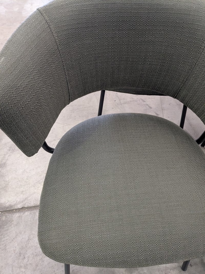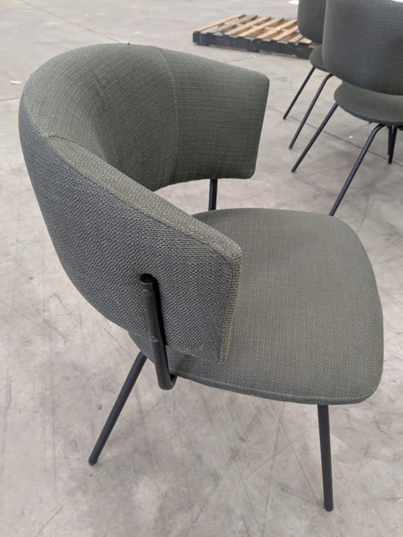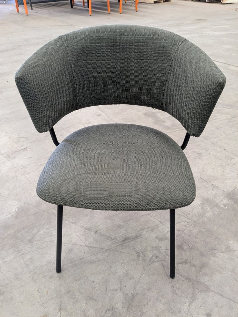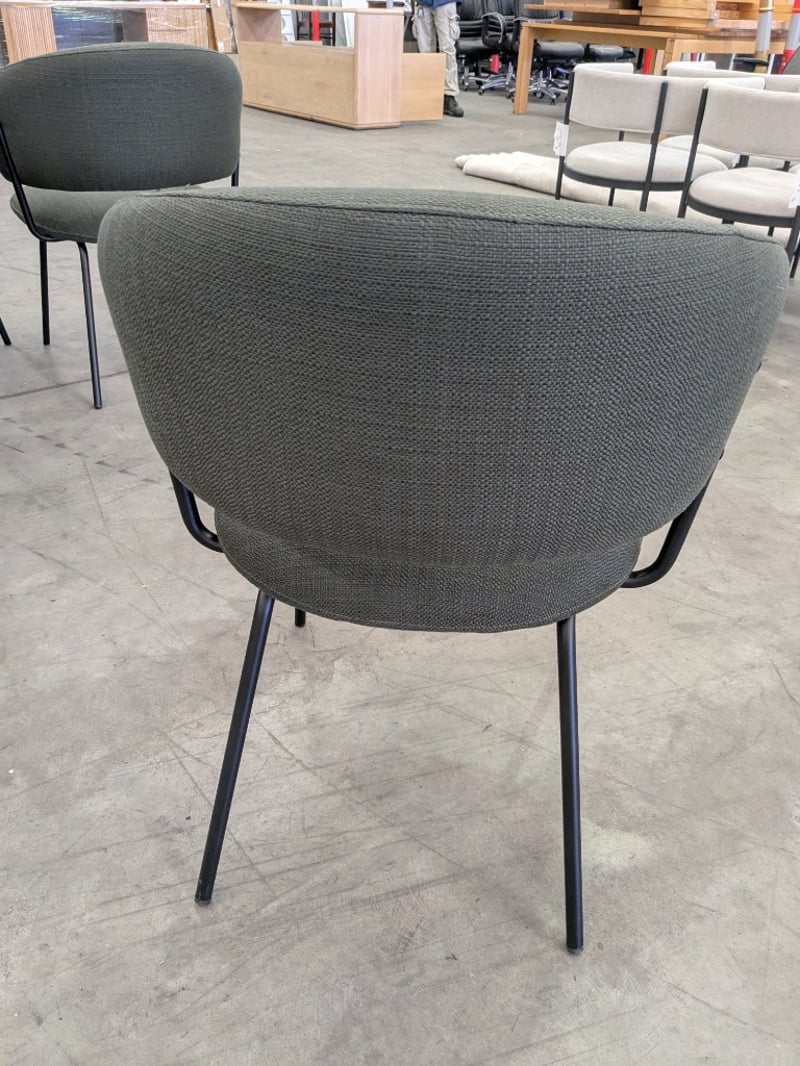 Elegant mid-century-inspired dining chair featuring rounded cushions upholstered in a rich khaki-toned farbric. The sleek powder-coated black metal legs provide clean contrast and a modern silhouette.