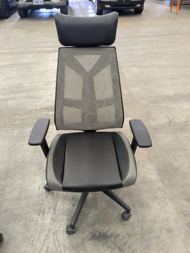 Office Chairs, High Back with Arm & Head Rest, Black & Gray Leather & Plastic Style Finish, Adjustable Height & Back, Qty 4 Items