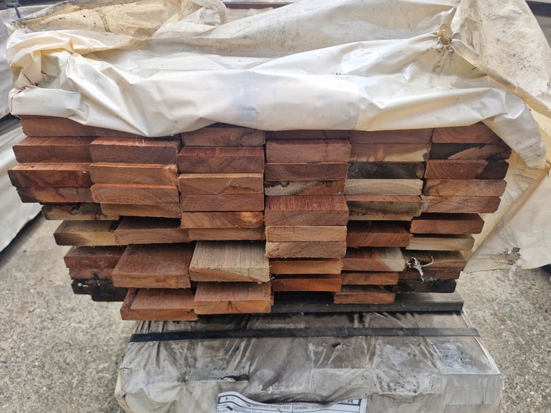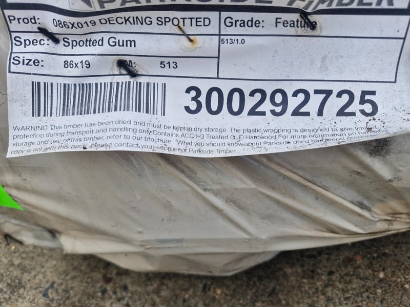 Timber Decking Hardwood, Spotted Gum, 86mm x 19mm Quantity: 513 lineal meters to pack Profile: 86mm x 19mm Random Lengths , Contains Shorts, Feature/Utility Grade, Unused. BID PER LINEAL METER, MUST TAKE 513 LINEAL METERS REF: 300292725