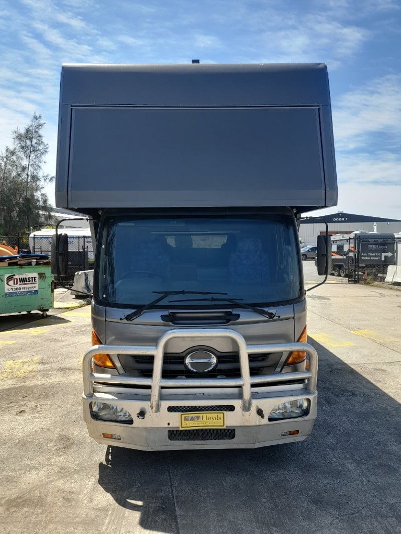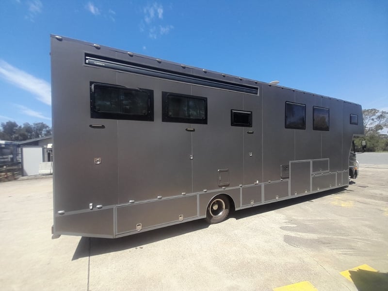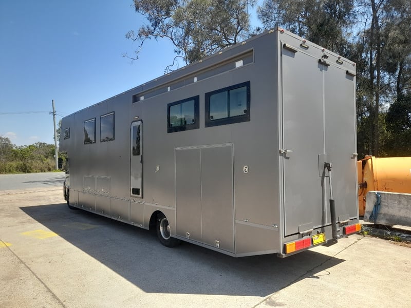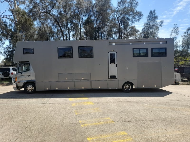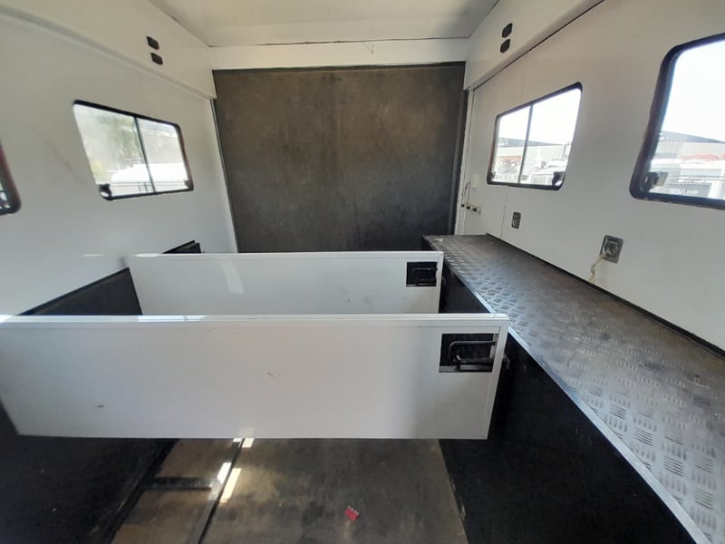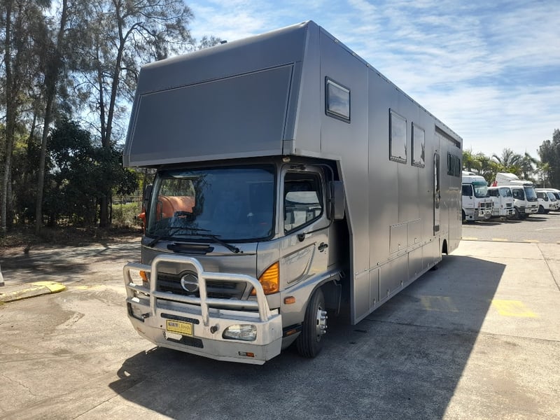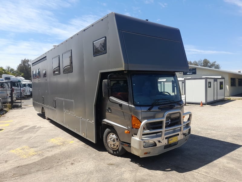 Description: horse float/ motor home, air con cab, 360 camera view small sleeper, cd player, drink holders in working condition, solar system with Inverter, battery and running equipment, plenty of storage, couch, fridge microwave and plenty of space
