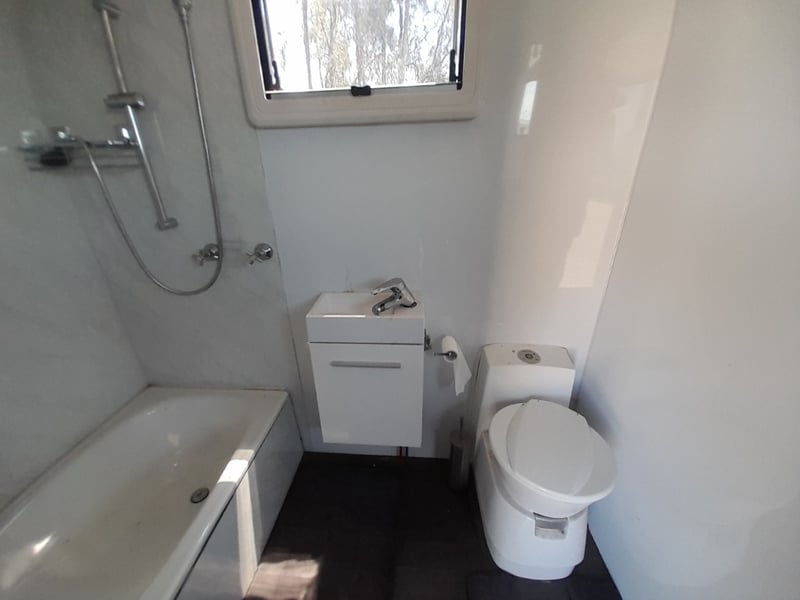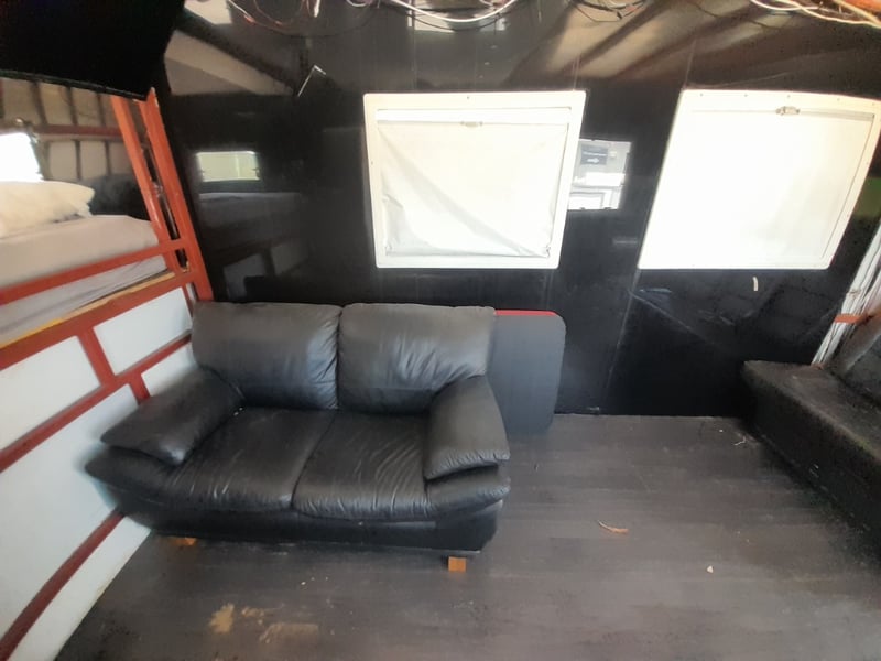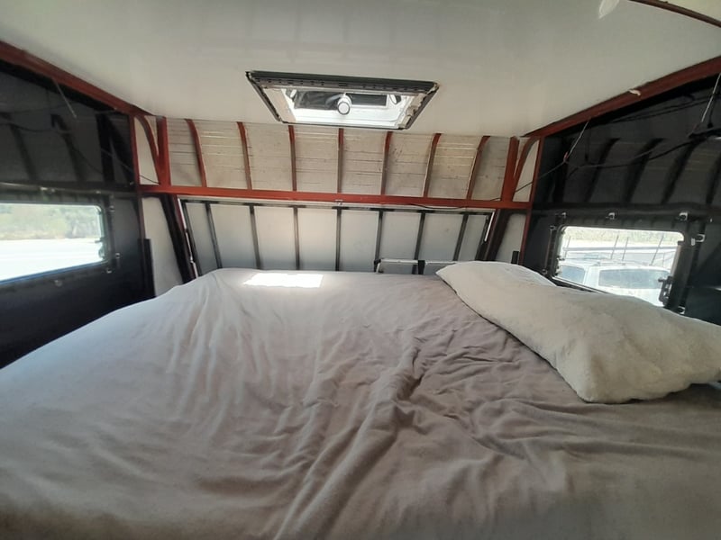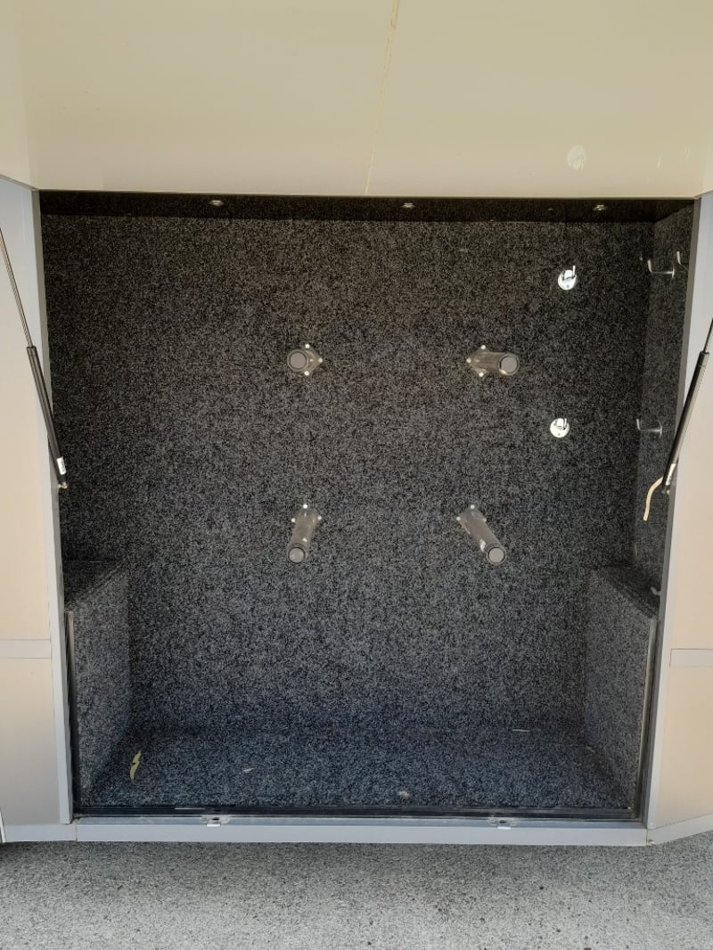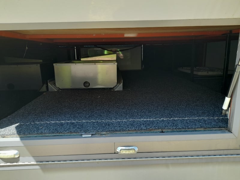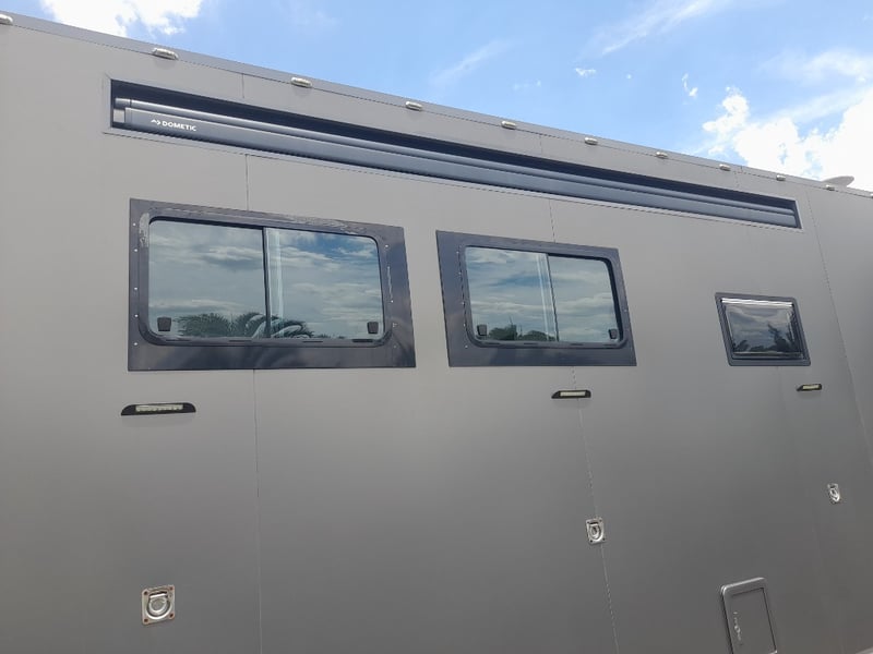 In the rear of truck in 3 horse bays, large sleeping quarters, large bathroom with shower/bath, sink and toilet, electric awning