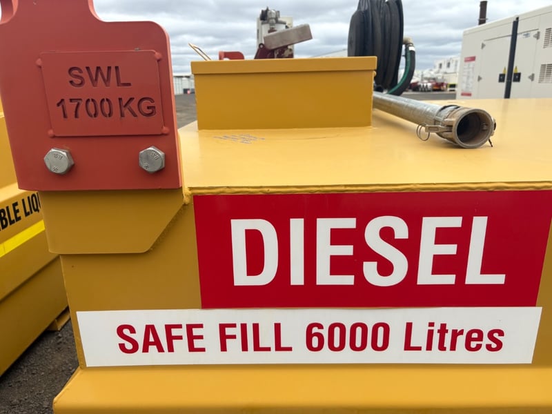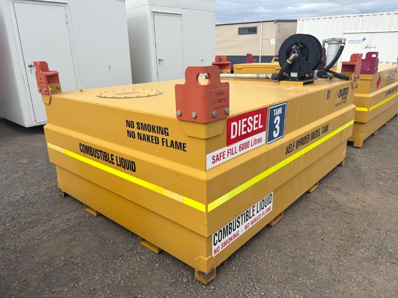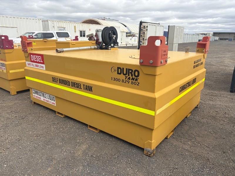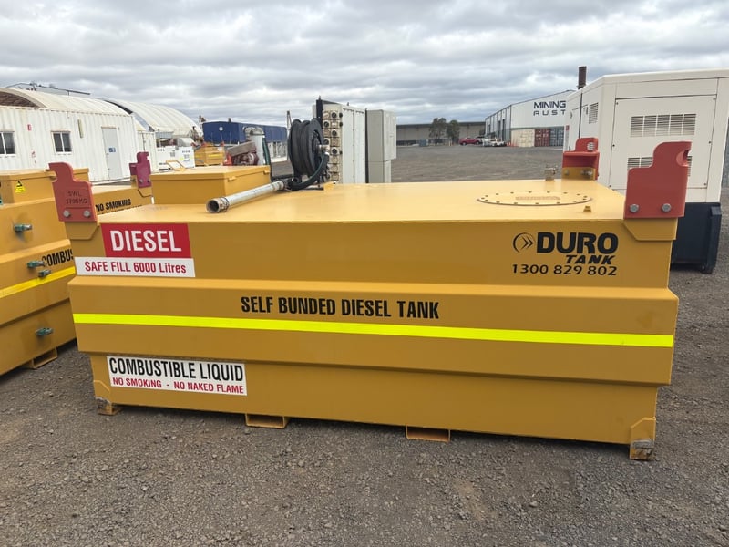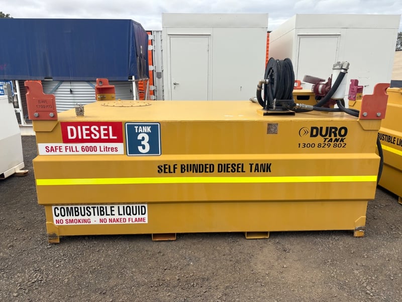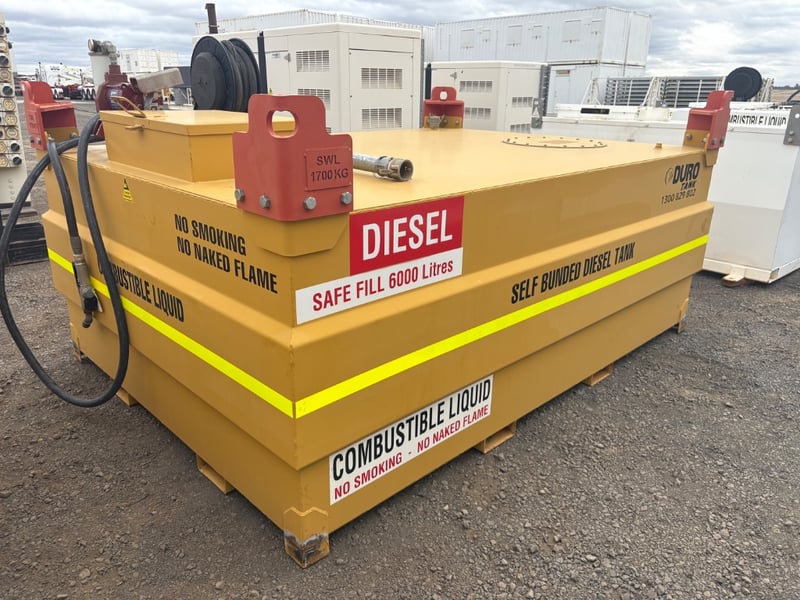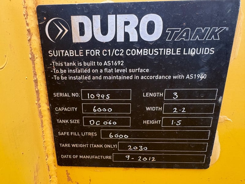 Diesel Tank, Duro Tank, Self Bunded Diesel Tank, Safe Fill 6000 Litres, Lifting Points SWL 1700kg, Tuthill 230volt Pump Hose and Nozzle, Serial No. 10995 Capacity: 6000L Tank Size: DC 060 Tare Weight: 2030kg (tank only) D.O.M: 9-2012 Size: 3m L x 2.2m W x 1.5m H LOCATION: Dubbo, NSW CONTACT: Glenn Aylward on 0418 665 100 or [email protected]