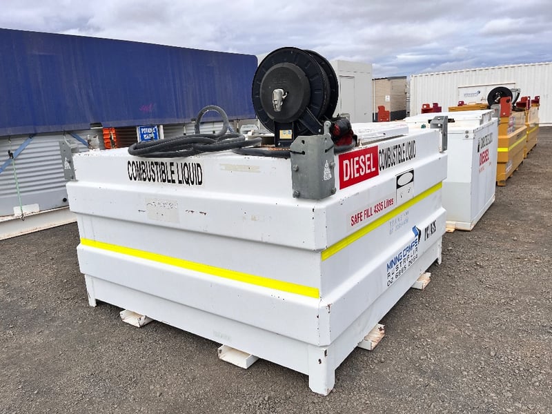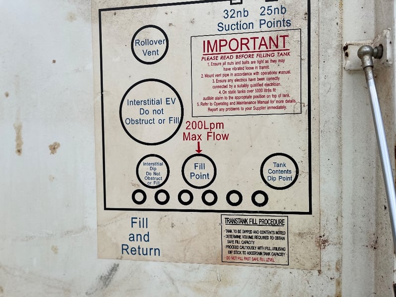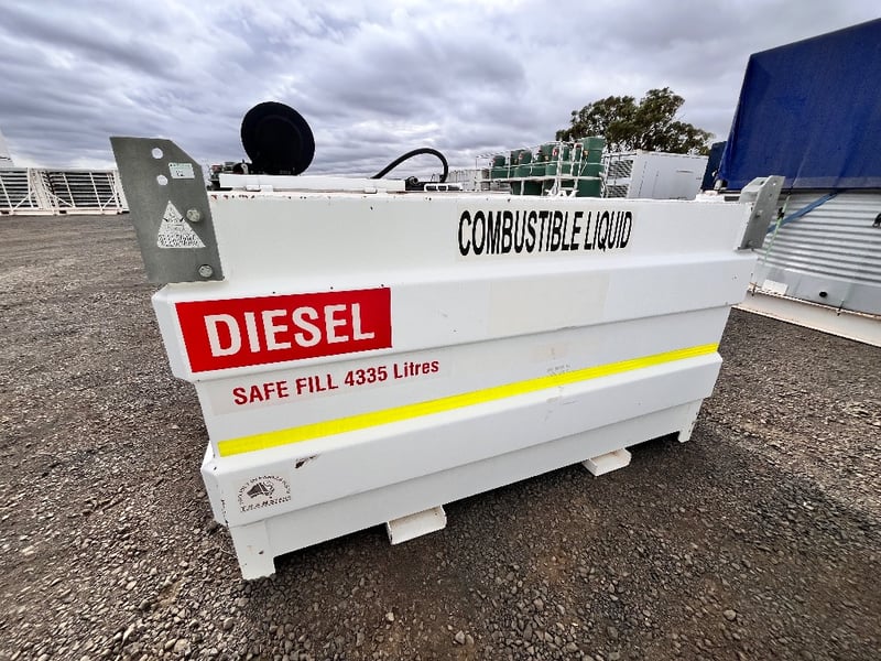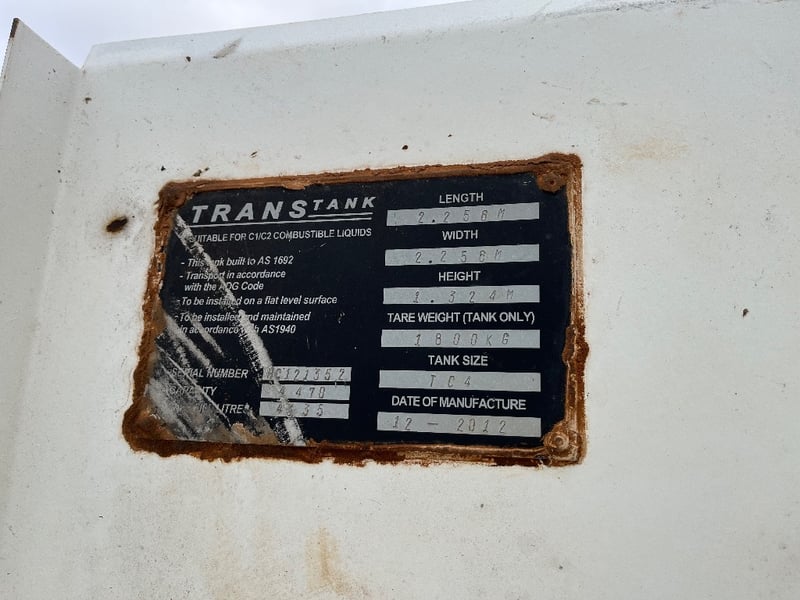 Diesel Tank, Transtank, Self Bunded Diesel Tank, Safe Fill 4335 Litres, Equipco Pump Nozzle and Hose Lifting Points SWL 1700kg Serial No. HC121352 D.O.M. 2012 Capacity: 4335L Tare Mass: 1800kg Tank Size: TC4 Size: 2.256m L x 2.256m W x 1.324m H LOCATION: Dubbo, NSW CONTACT: Glenn Aylward on 0418 665 100 or [email protected]