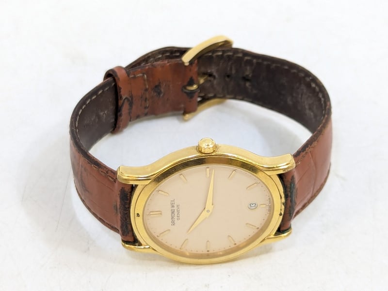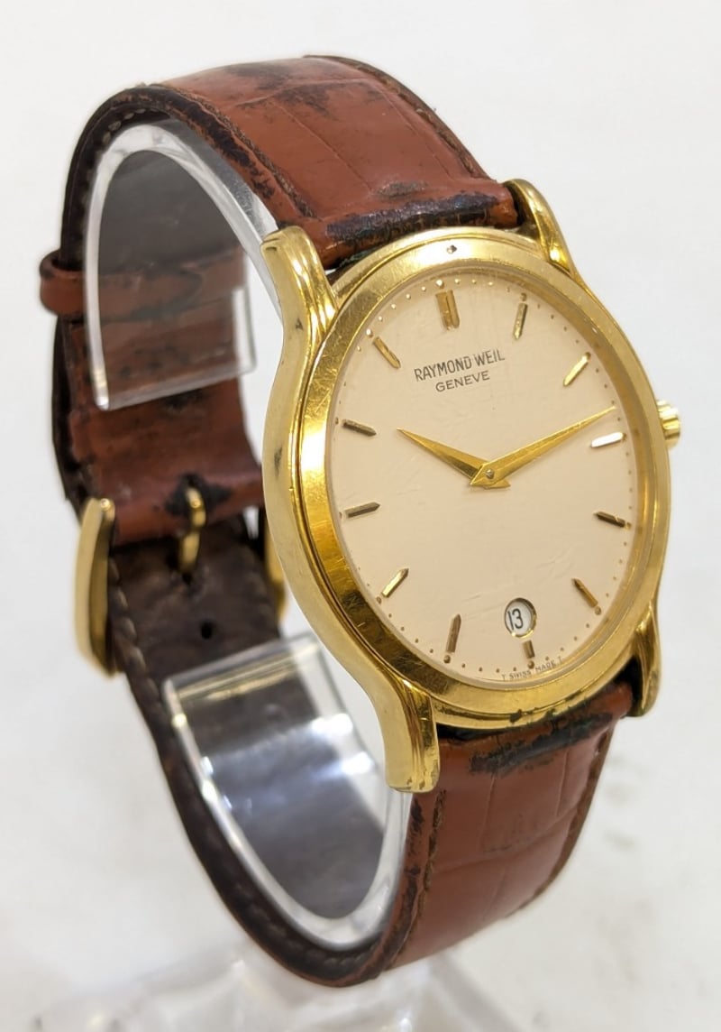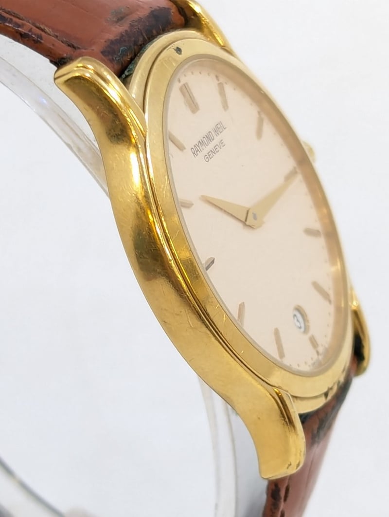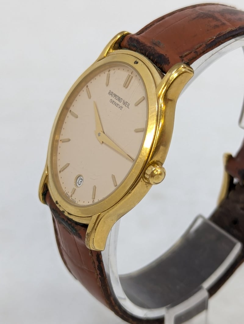 RAYMOND WEIL ELLIPSE GENEVE 5571 DIAL: WHITE DIALCASE DESCRIPTION: 18K GOLD ELECTROPLATEDCASE SIZE: 32MMBRACELET: LEATHER STYLEBOX: NOT INCLUDEDPAPERS: NOT INCLUDEDCondition: Good - Refer To ImagesAdditional Information: Non Numerical Hour MarkersDate Display At 6 O'Clock PositionBuckle ClaspWater Resistant: 3 Atm585005+2