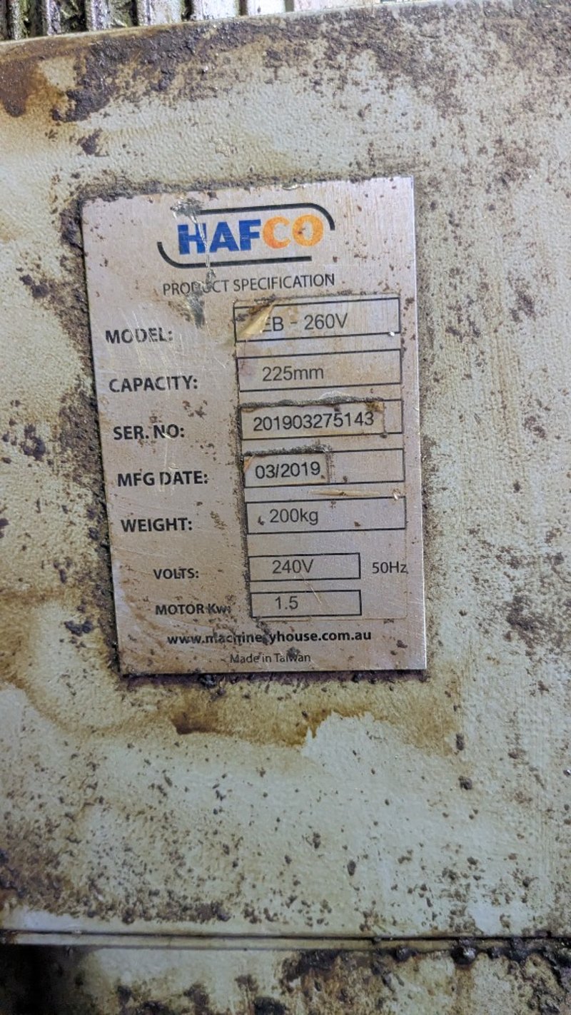 Hafco Metal master EB260V BandsawBrand: HafcoModel: Eb-260vSerial no: 201903275143Date of Manufacture: 03/2019Description/Extras: Swivel Cutting Head, Coolant Dispenser, 240v , Push Button Control, Includes Assorted Cutting BladesDimensions: 1200mm(W) x 500mm(D) x 1350mm(H) SOLD AS LOT NOTE: INSPECTIONS HIGHLY RECOMMENED, BUYER TO PROVIDE OWN LABOUR AND TOOLS FOR SAFE REMOVAL OF ASSET NOTE: INSPECTIONS HIGHLY RECOMMENDEDLocation: Archerfield, QLD Contact: Jamie Fountain - 0486 045 295 or [email protected]