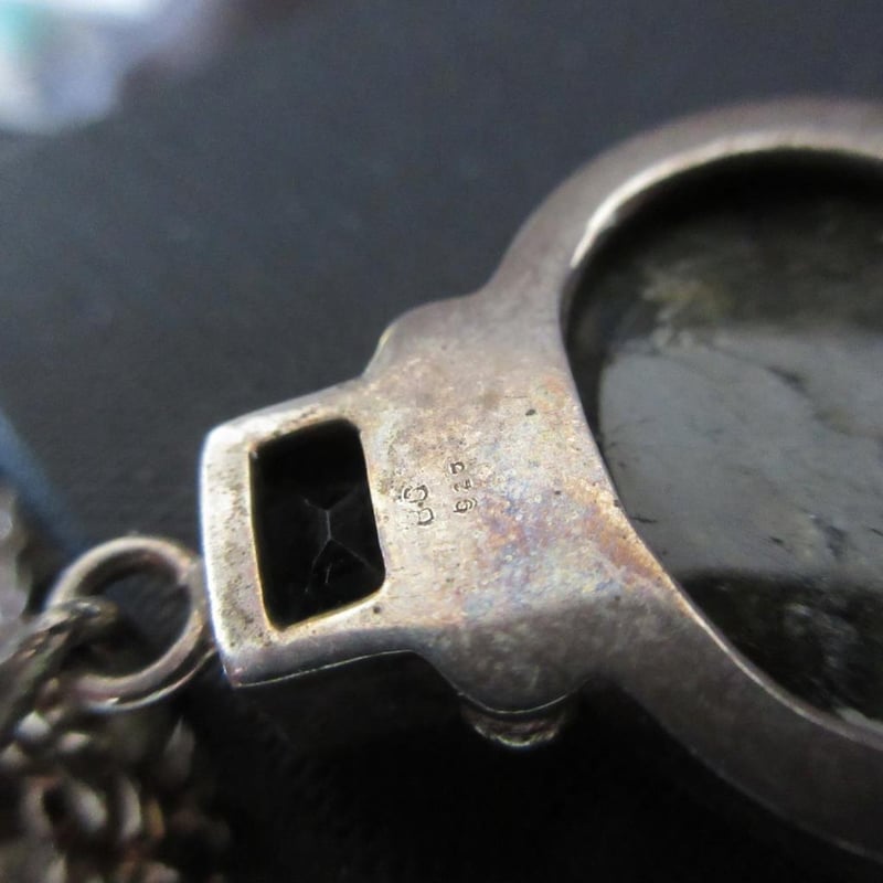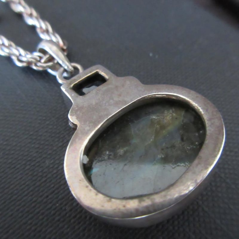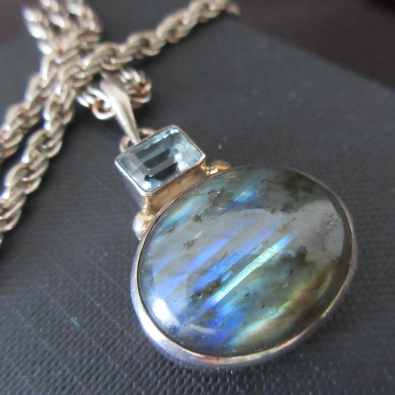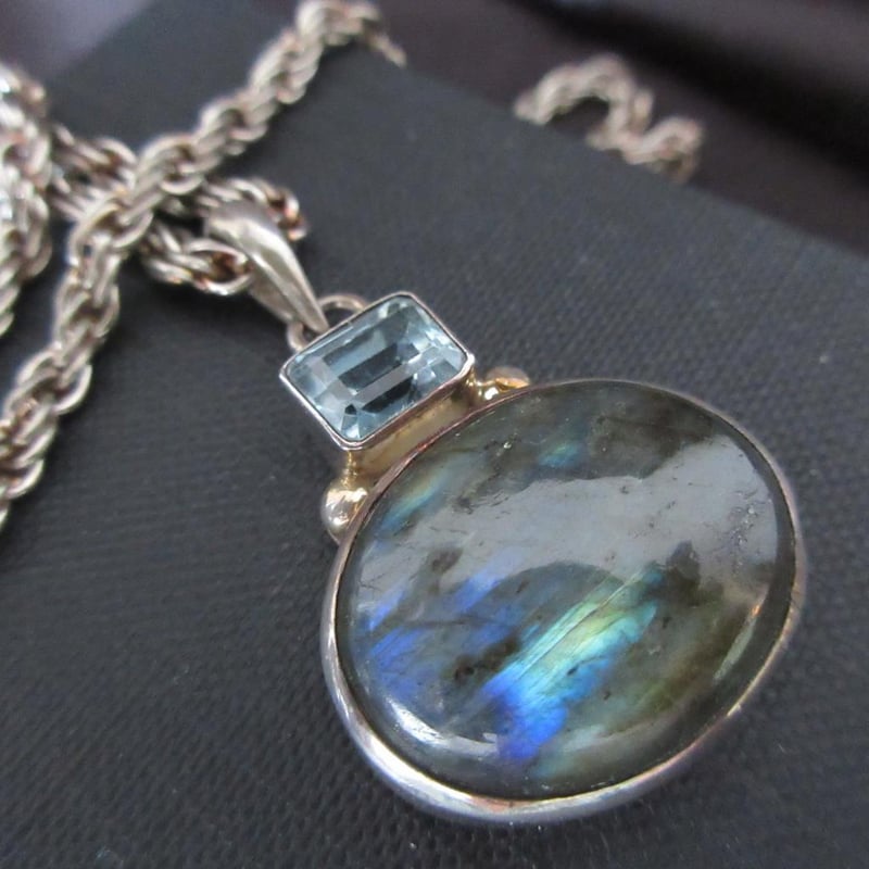 Estate Sterling Silver Large Impressive Labradorite & Blue Topaz Pendant (Stamped 925) (approx 40mm x 25cm drop) On Thick Chain (Boxed)
