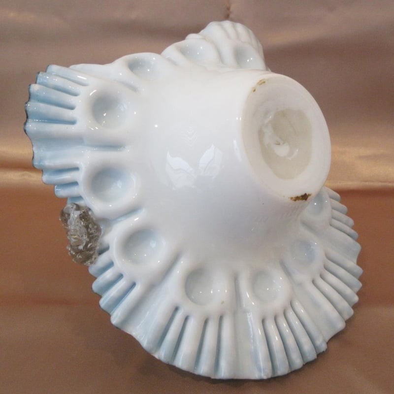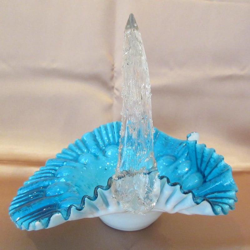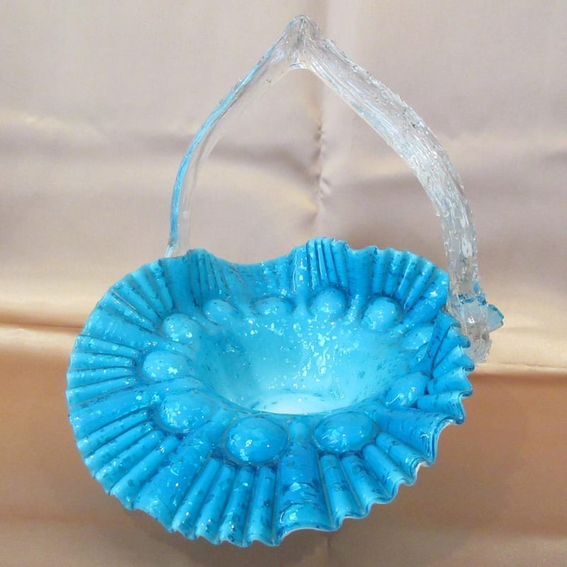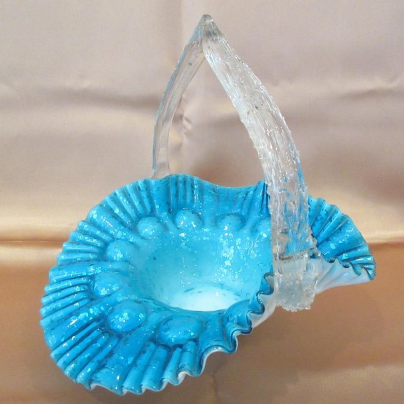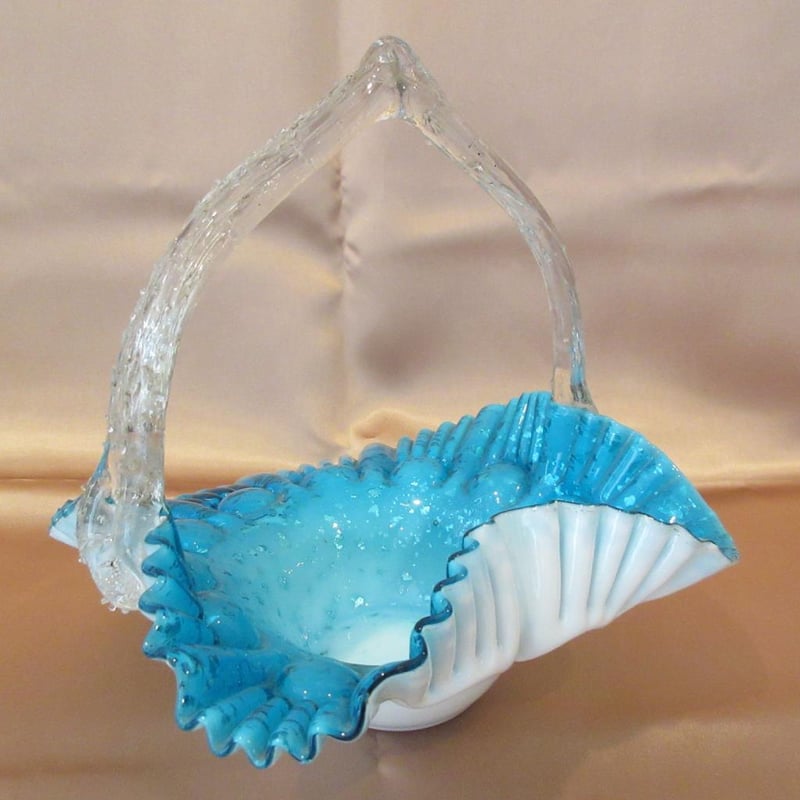 Estate Large Victorian White Cased Blue Glass Basket With Applied Branch Handle Graduating From Thorny to Smooth Branch (approx 20cm tall x 20cm wide)