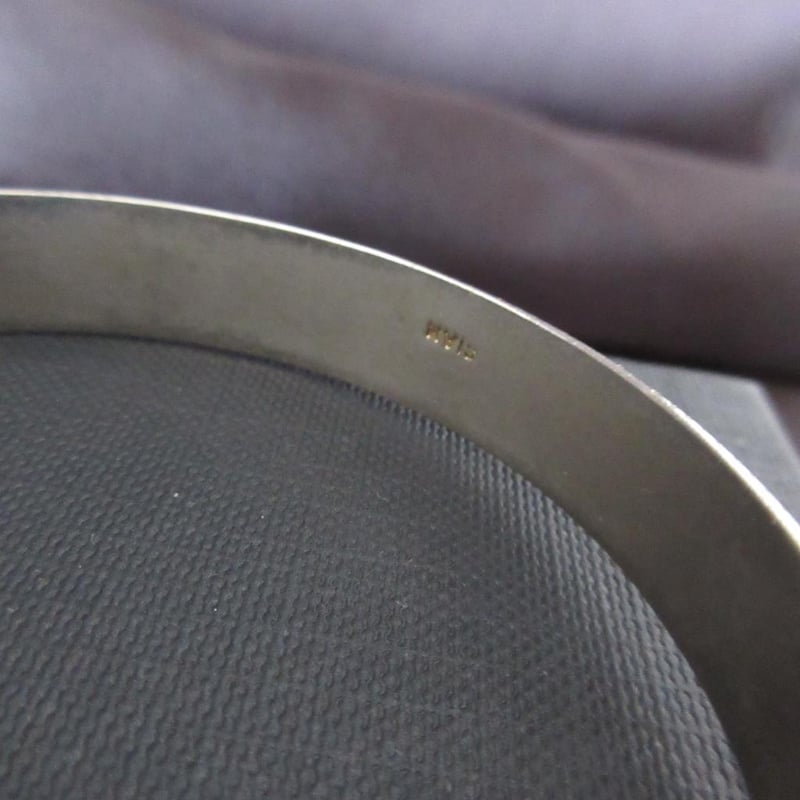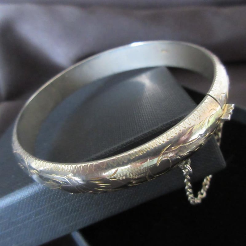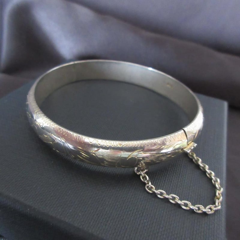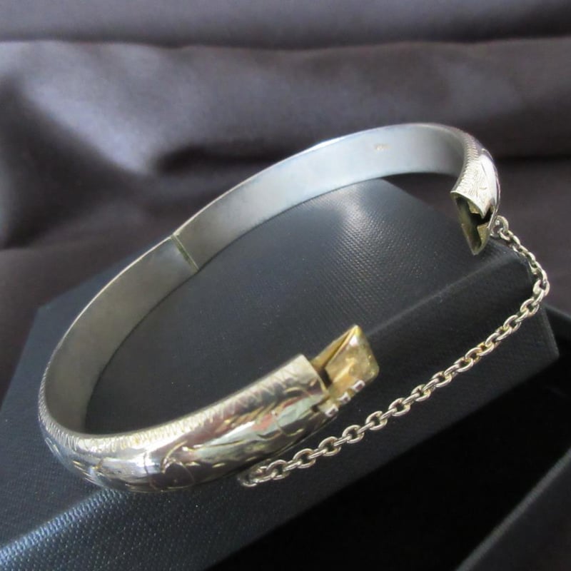Vintage Elegant Siam Engraved Silver Bangle With Safety Chain (Stamped) (Boxed)