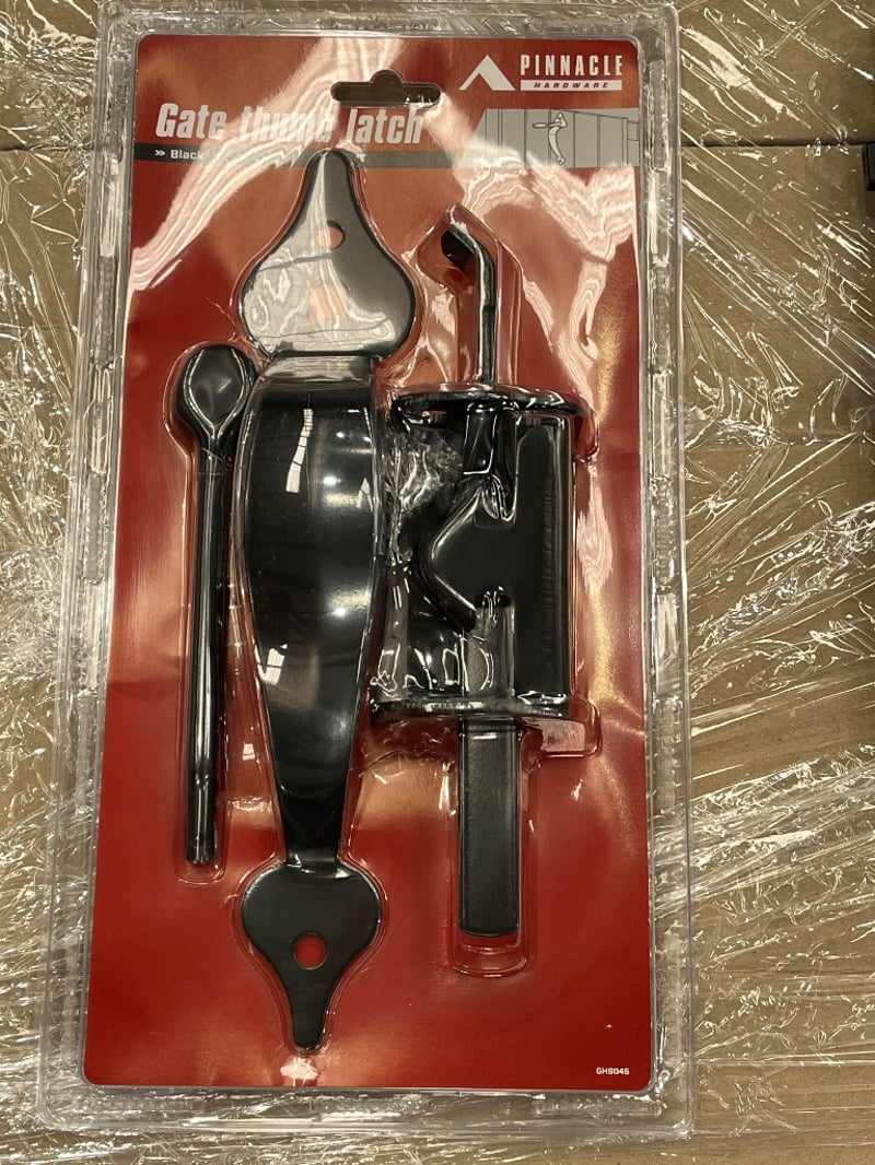 RRP $39.95 ea, Pinnacle Hardware Gate Thumb Latch in Black, quantity 10, sold as lot