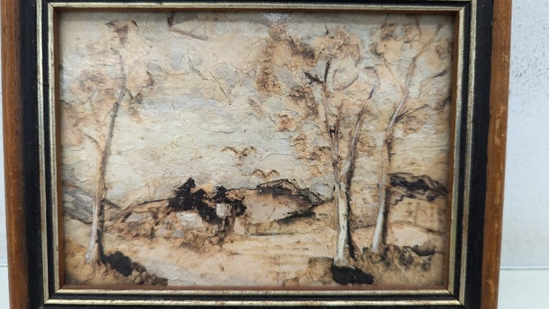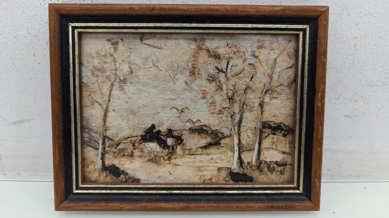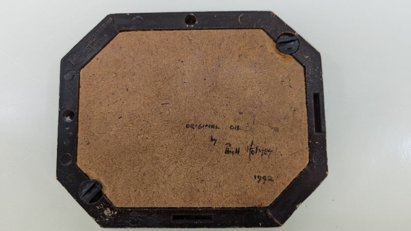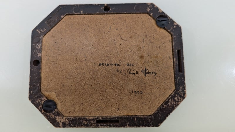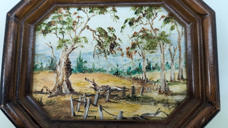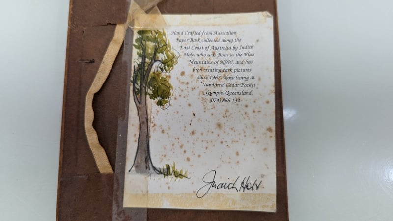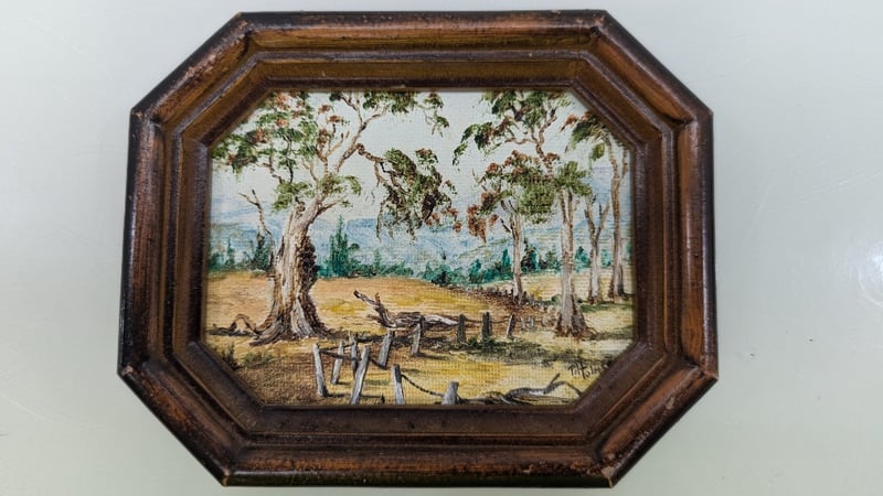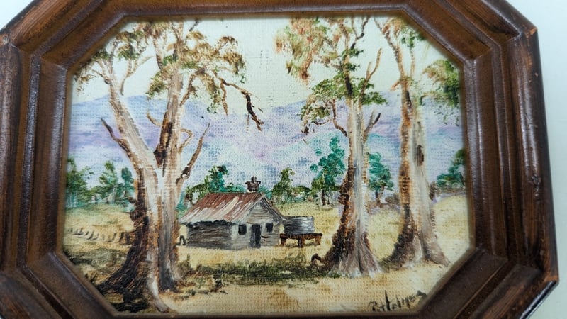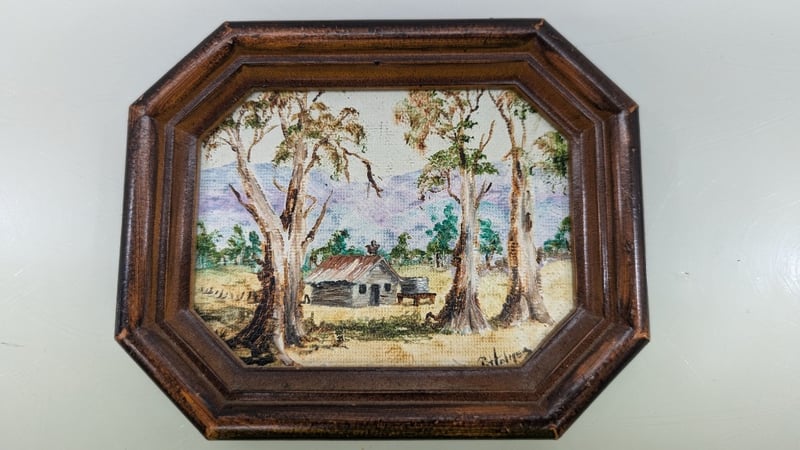Art Work, Phyll Holmes Original Oil on Canvas 1992 Timber Frame Dimensions 11.5cm(H)×14cm(W)×2cm(D) Quantity 2 Judith Holt Paper Bark on Board Timber Frame Dimensions 13cm(H)×16.5cm(W)×1.5cm(D) Sold As Lot