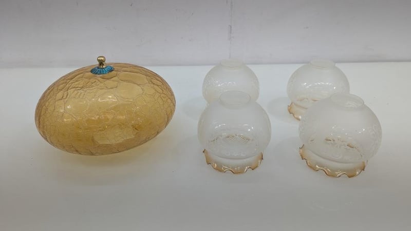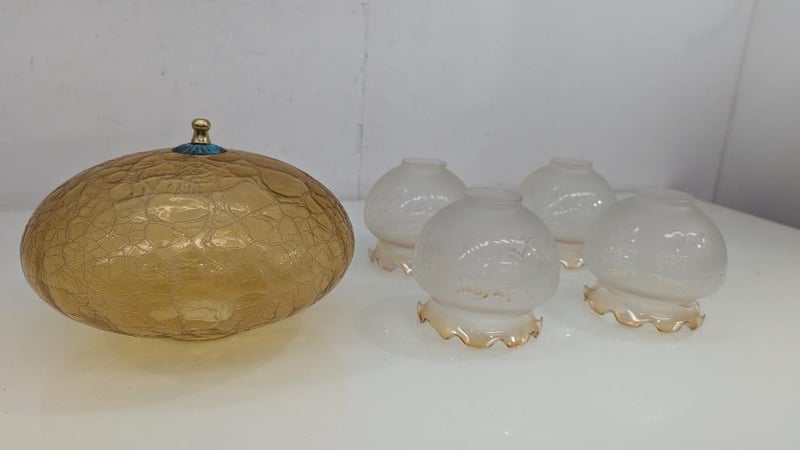 Glass Light Coverings, Large Embossed Tinted Cover, Four Frosted with Design, Flared Opening, Dimensions Ranging From 18cm(H)×27cm(W) to 13cm(H)×14cm(W), Quantity 5Sold As Lot