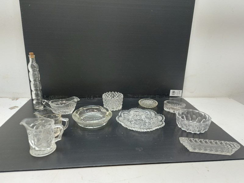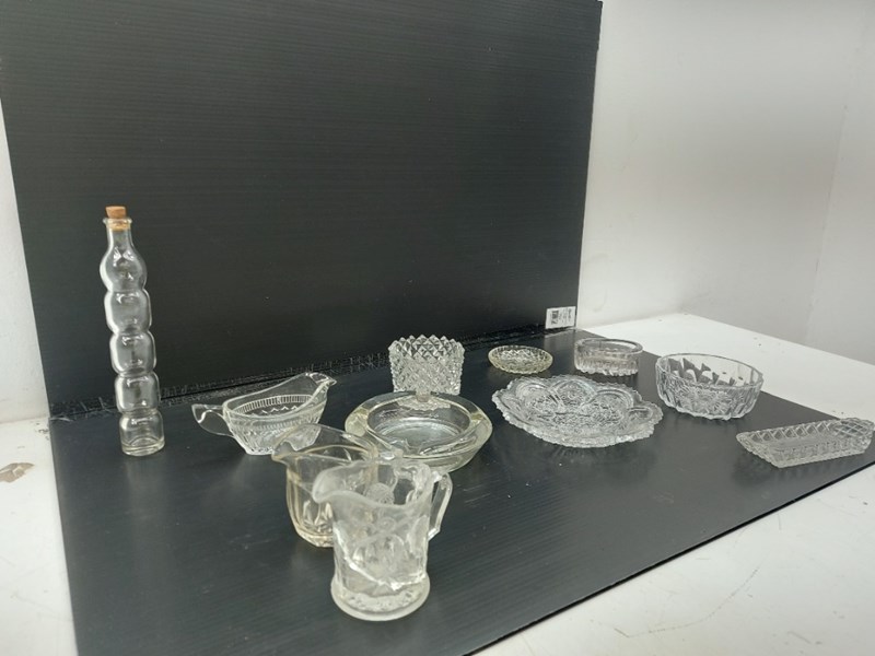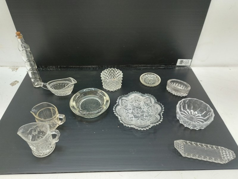 Assorted Glass Lot Includes, Glass Cork Bottle, Ashtray, Candy Dish, And More, Quantity 11Sold As Lot