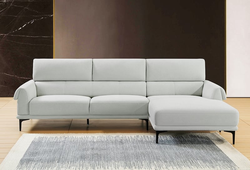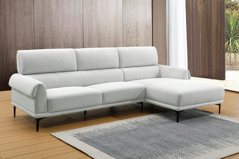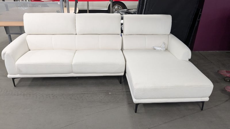Ascona Lounge with Chaise - White, RRP: $6,258 The Ascona is especially designed to deliver the feel of an extra-large lounge while using only standard amount of valuable floorspace. The high padded backrest provides great looks and very comfortable support, yet does not add much to the total depth of the sofa, keeping it at only 90cm from wall. The seats are extra deep and comfy, the chaise is very wide (102cm), and the whole combination creates a feeling of sitting on a much bigger piece. Beyond the optimised ratio of internal-to-external measurements, the Ascona presents a pleasant European-inspired design with soft rounded understated lines, adding to the general appeal of lightness and cosy comfort. - High quality wool and cotton blend upholstery - European-inspired design with soft rounded lines - Super spacious internal space within regular footprint - Extra deep seats - Extra-wide chaise (102cm wide) on the Right - External measurements: Back 276cm x Depth 90cm x Chaise length 154cm - Colour: White Note, Ex Display Stock, Signs of wear