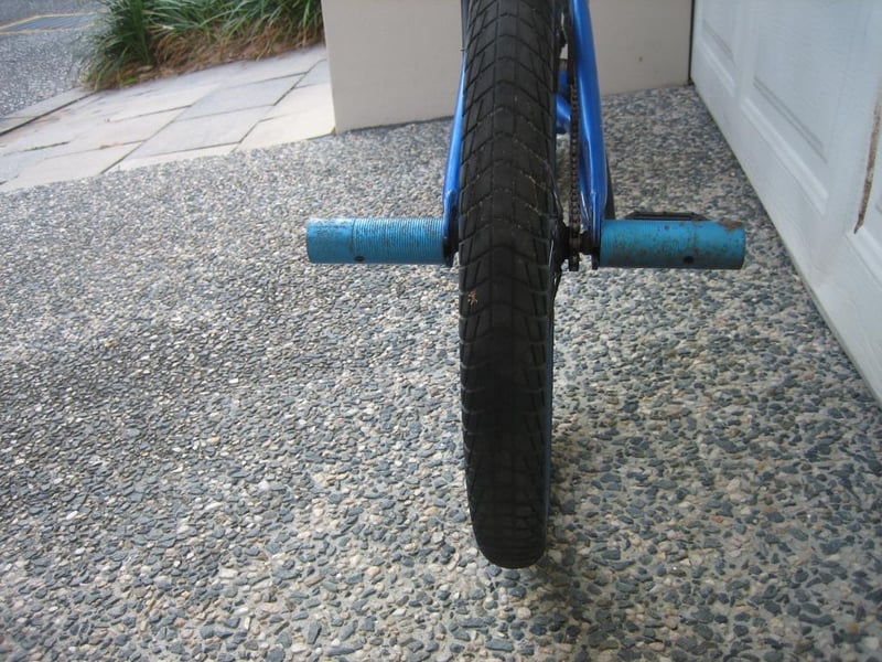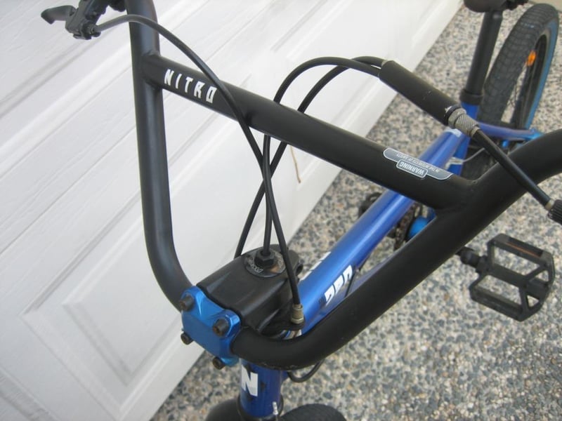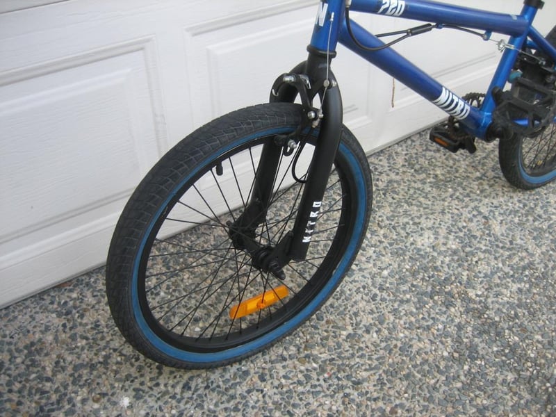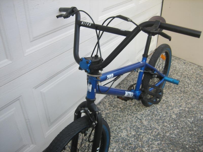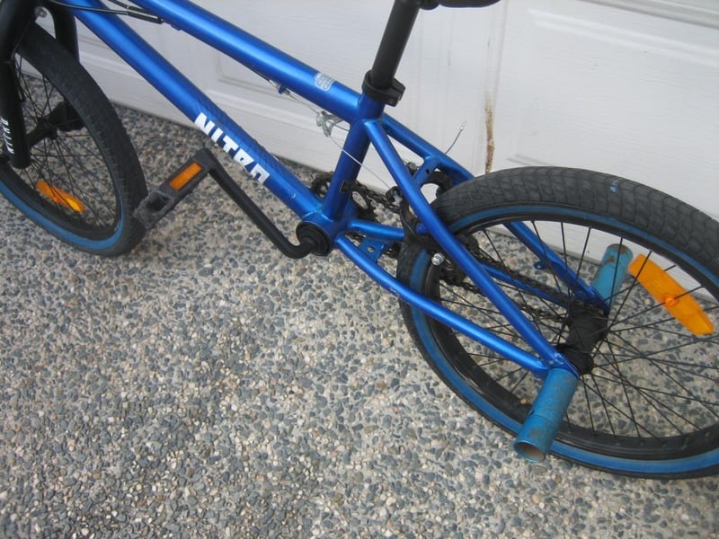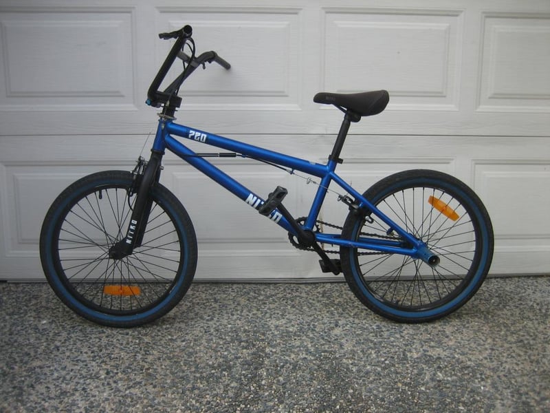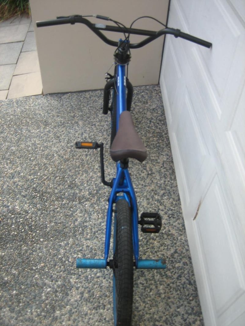 BMX Stunt bike, with rear pegs, Aluminium rims, blue/black in colour.