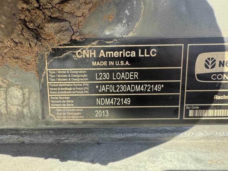 2013 New Holland L230 Skid Steer Loader Price Guide - $34,193 - $48,351 (Based on standard condition unmodified, excluding attachments and/or additions) Year: 2013 Make: New Holland Model: L230 Super Boom Body: Loader/ Skid steer Hours Indicated: 1079 hrs Engine: FPT F5H 3.4L 4 Cylinder Turbo Diesel Engine Number: Not located PIN: JAF0L230ADM472149 Serial Number: NDM472149 Description/Extras: - 4 in 1 Norm Bucket - 90 HP - Super Boom Vertical Lift linkage - High Flow - Low Hours - Marks and Scratches - Joystick Steering - Slight leak in FL Bucket ram as pictured - Owners Manual Note: Please see photos & inspect for damages. Buyer is responsible for the removal of asset. Contact Nektarios Samiotis on 0477 237 839 or [email protected] As Standard Auction Practice all Vehicles are Sold Unregistered without Number Plates LOCATION: Onsite Humpty Doo, NT (Not Lloyds Branch)