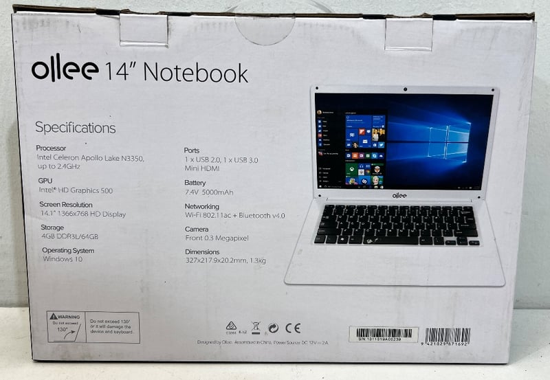 Laptop, Ollee, 14”, white, Dimensions approx: 33cm x 22cm x 1.3cm