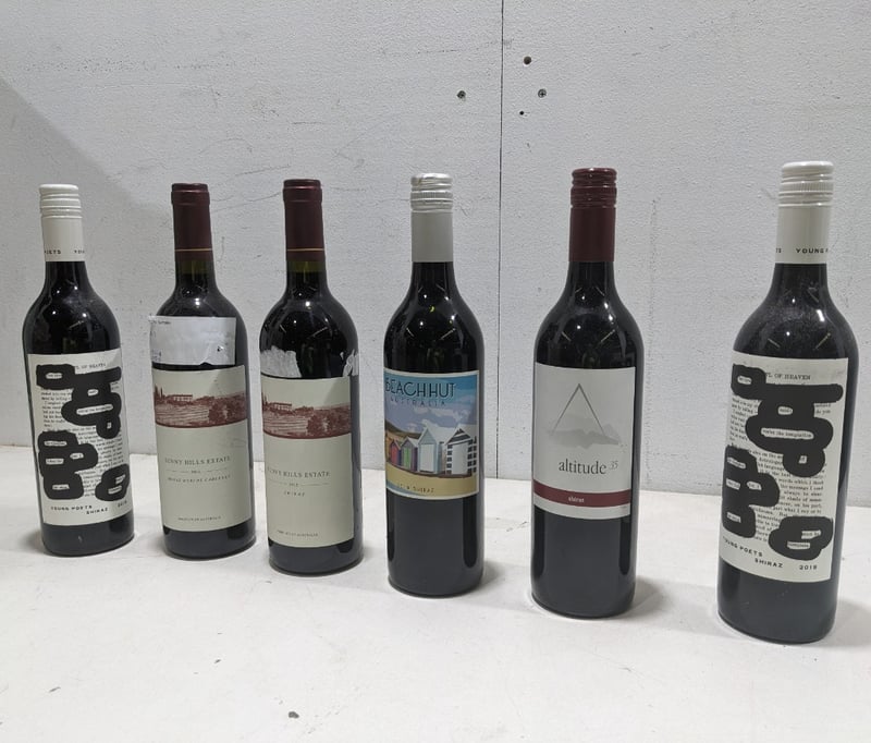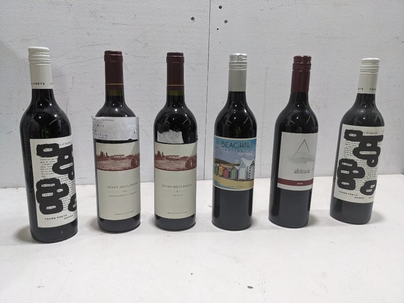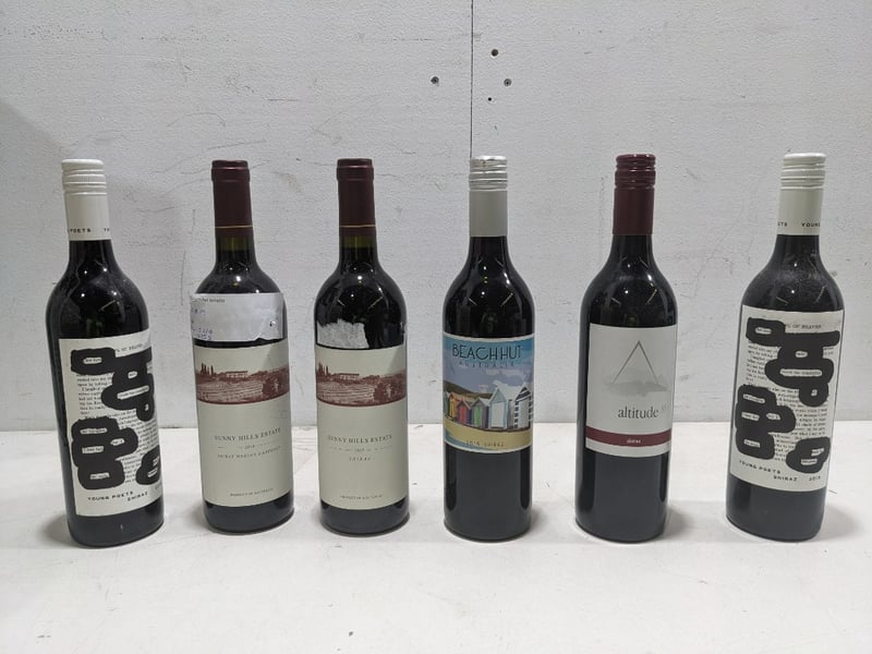 Assorted wine bottles 750ml, includes sunny hills estate, altitude 35 and more..