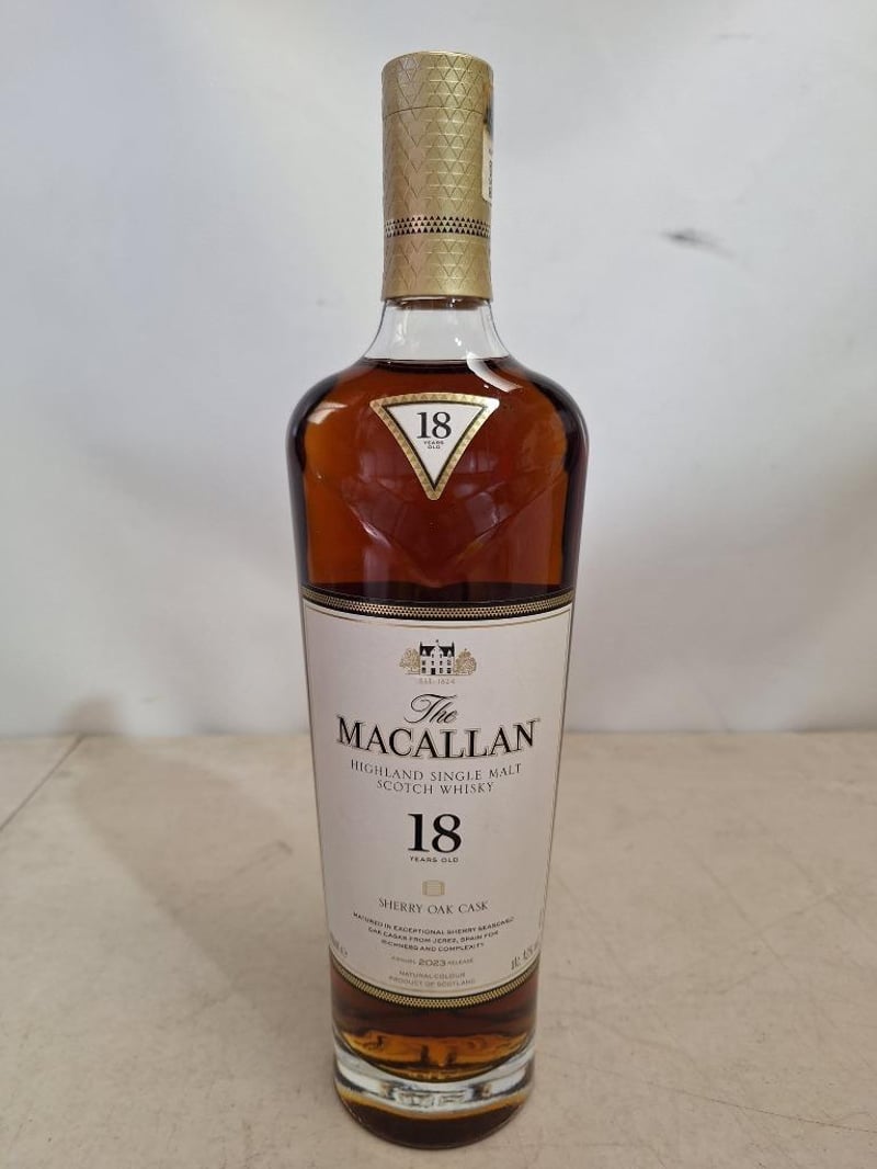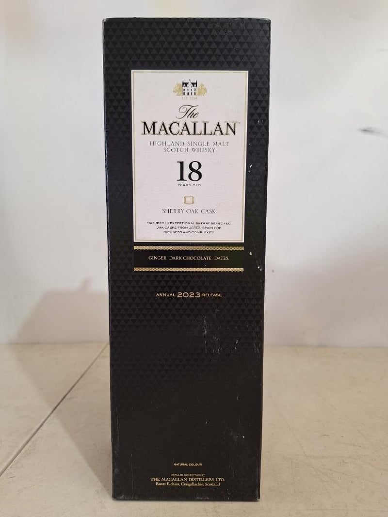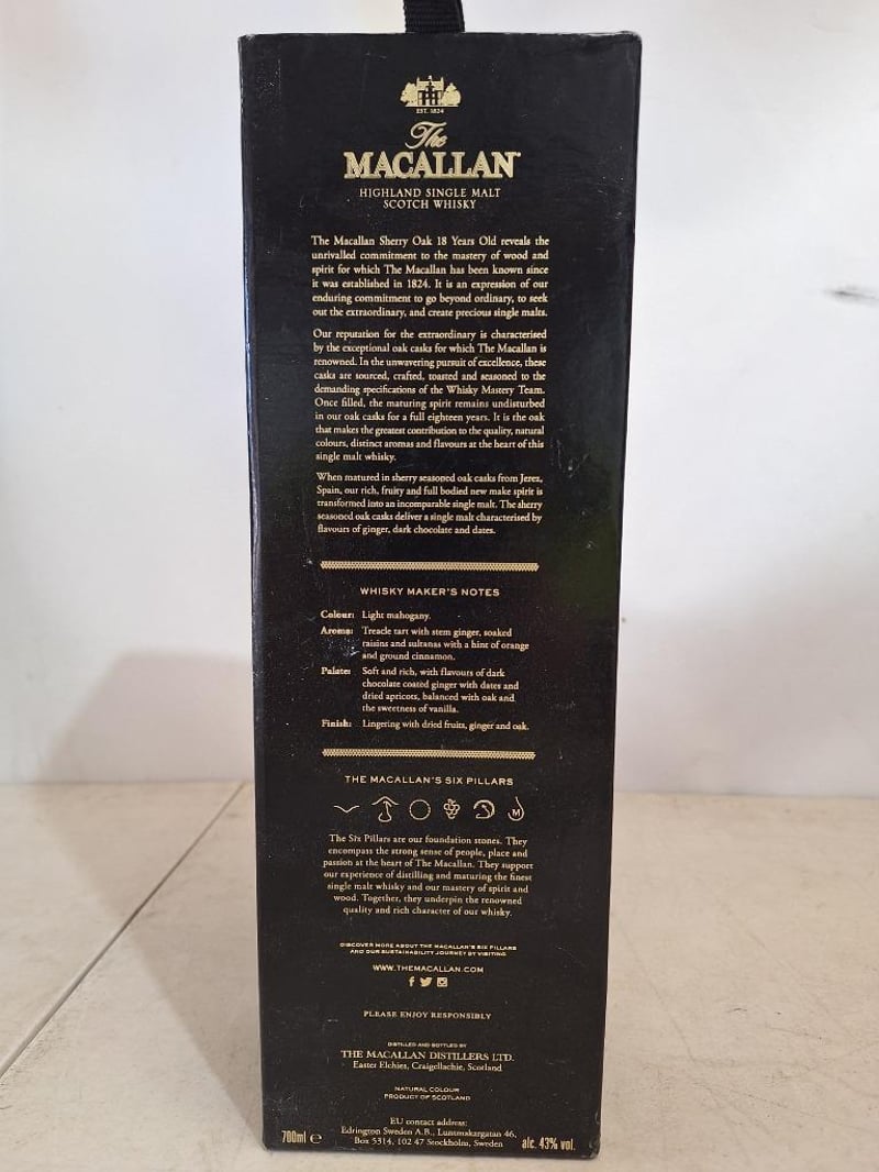 THE MACALLAN HIGHLAND SINGLE MALT SCOTCH WHISKY 18 YEARS OLD, SEALED IN SHERRY OAK CASK, 700ML, 43%VOLSize: Condition: Excellent - Refer To Images+22