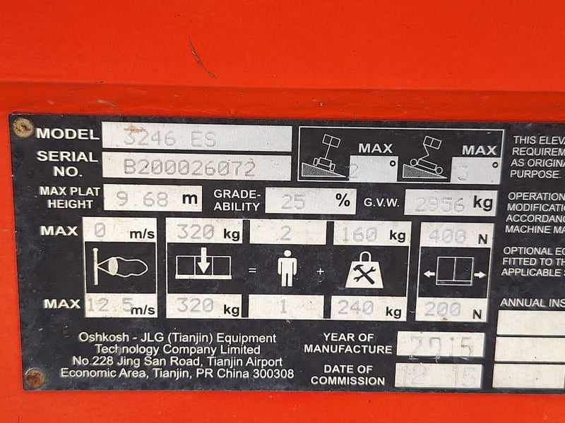 Description/Extras: Deck/Ground Control, Extendable Deck, Amber Light, E-Stops, Lifting Points, Max Platform Height 9.68m, Grade Ability 25%