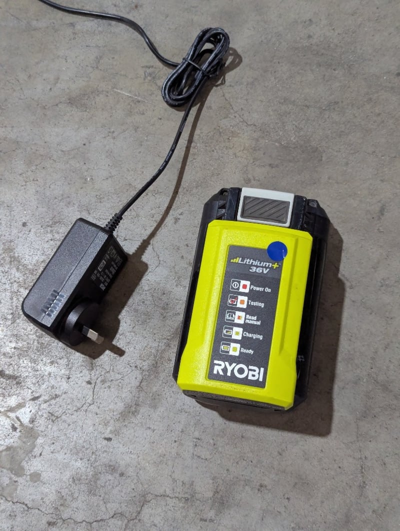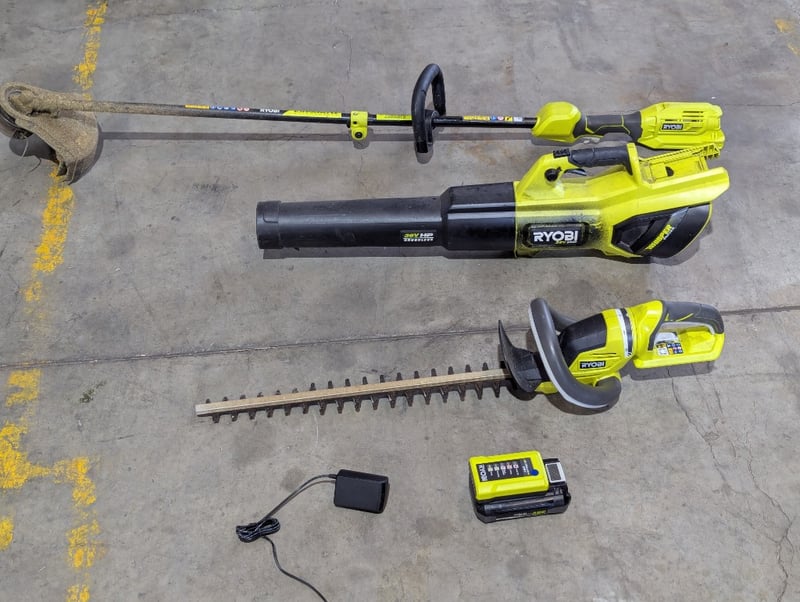 Assorted Ryobi Tools, includes Ryobi 36V HP 35/40cm Line Trimmer, Ryobi 36V HP Brushless 600CFM Jet Blower, Ryobi 36V 60cm Hedge Trimmer, and battery pack