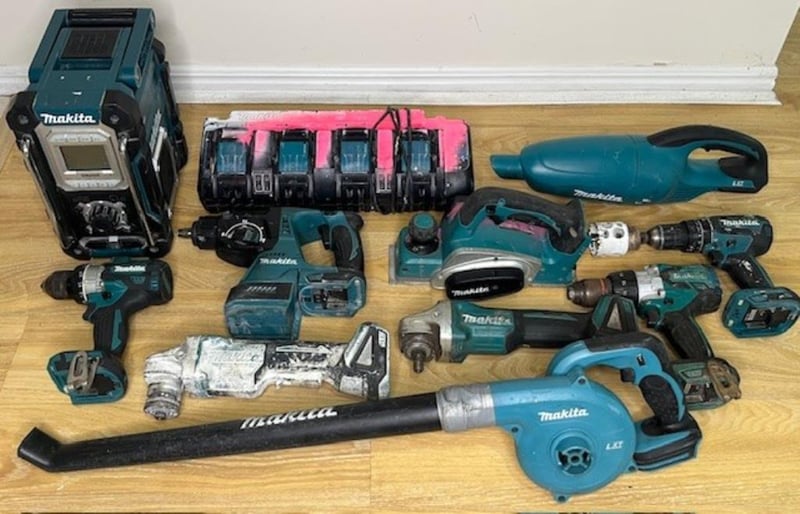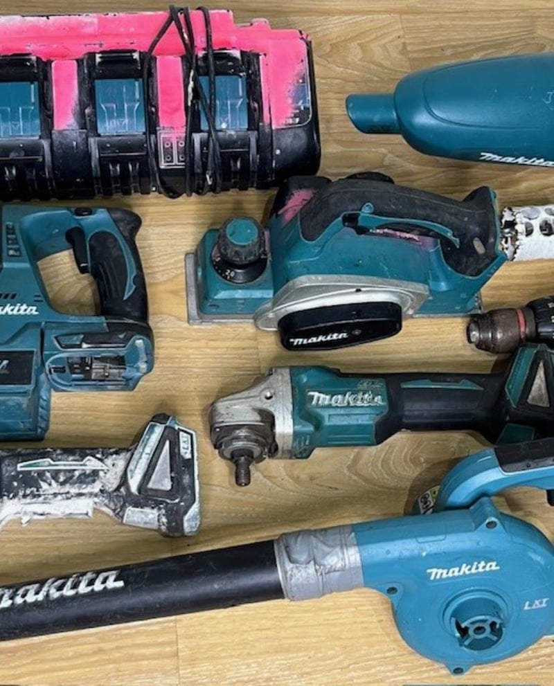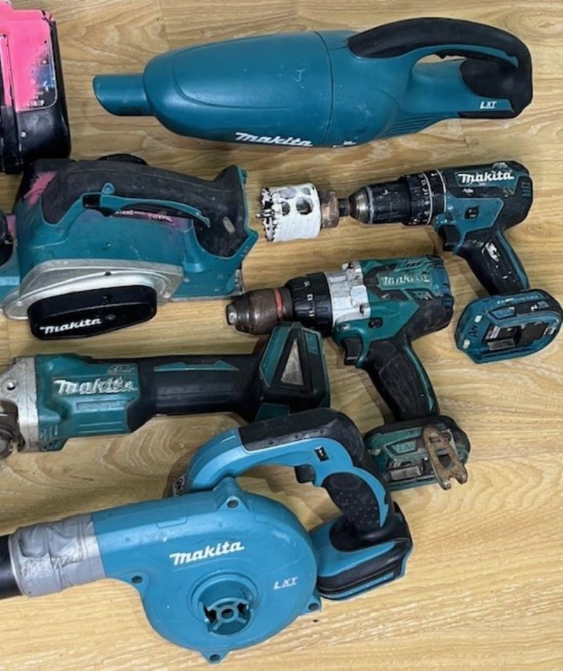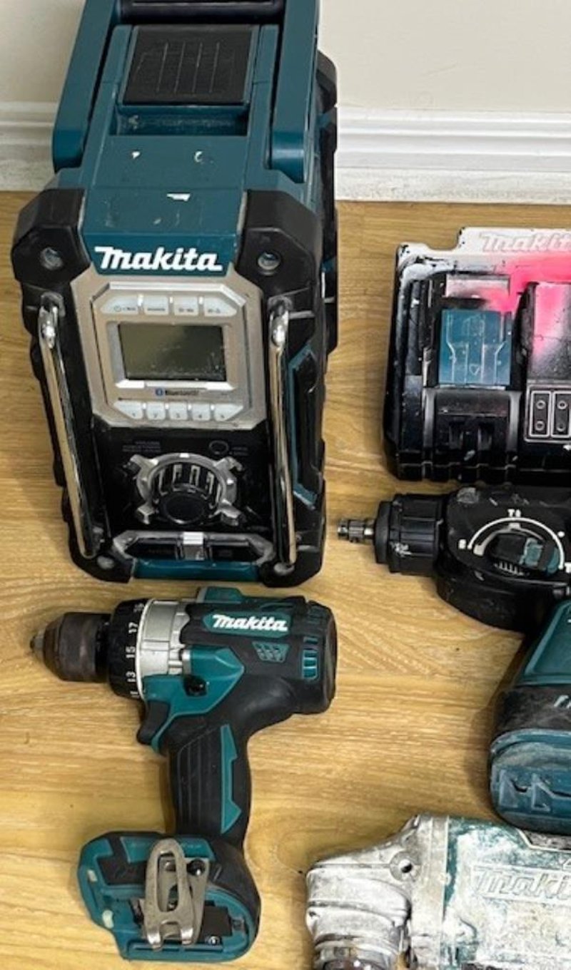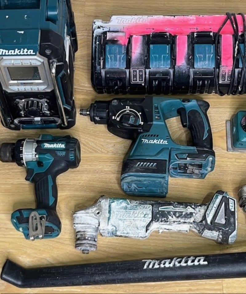 Cordless Makita 18V tools. 1 x DHP481 hammer drill, 1 x DHP485 hammer drill, 1 x DHP486 hammer drill, 1 x DMR108N bluetooth radio, 1 x DGA504 angle grinder, 1 x DGA508 angle grinder, 1 x DHR rotary hammer drill, 1 x DKP180 planer, 1 x DCL180 mini vac, 1 x DUB183 mini blower, 1 x DC18SF 4 port charger. Skins only, no batteries. Condition: Not working, untested, for parts or repair.