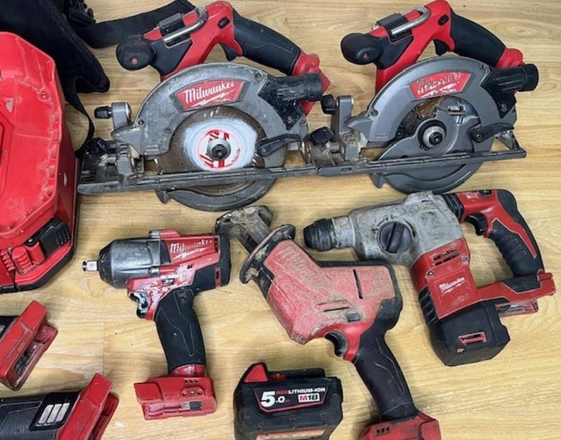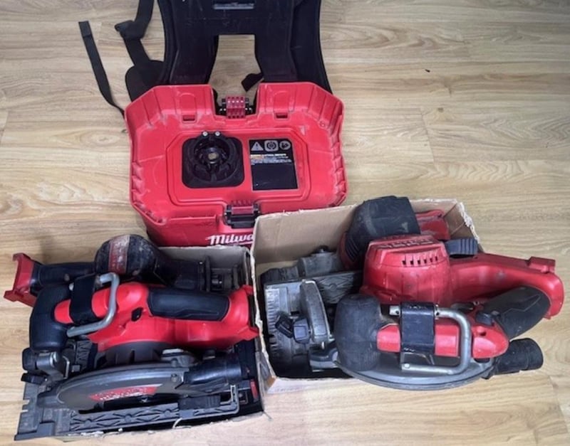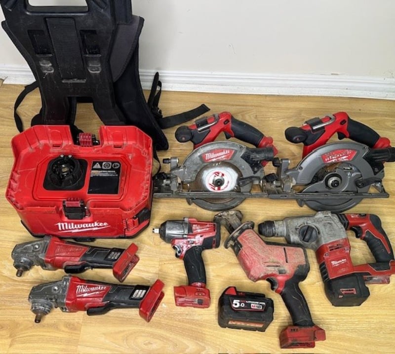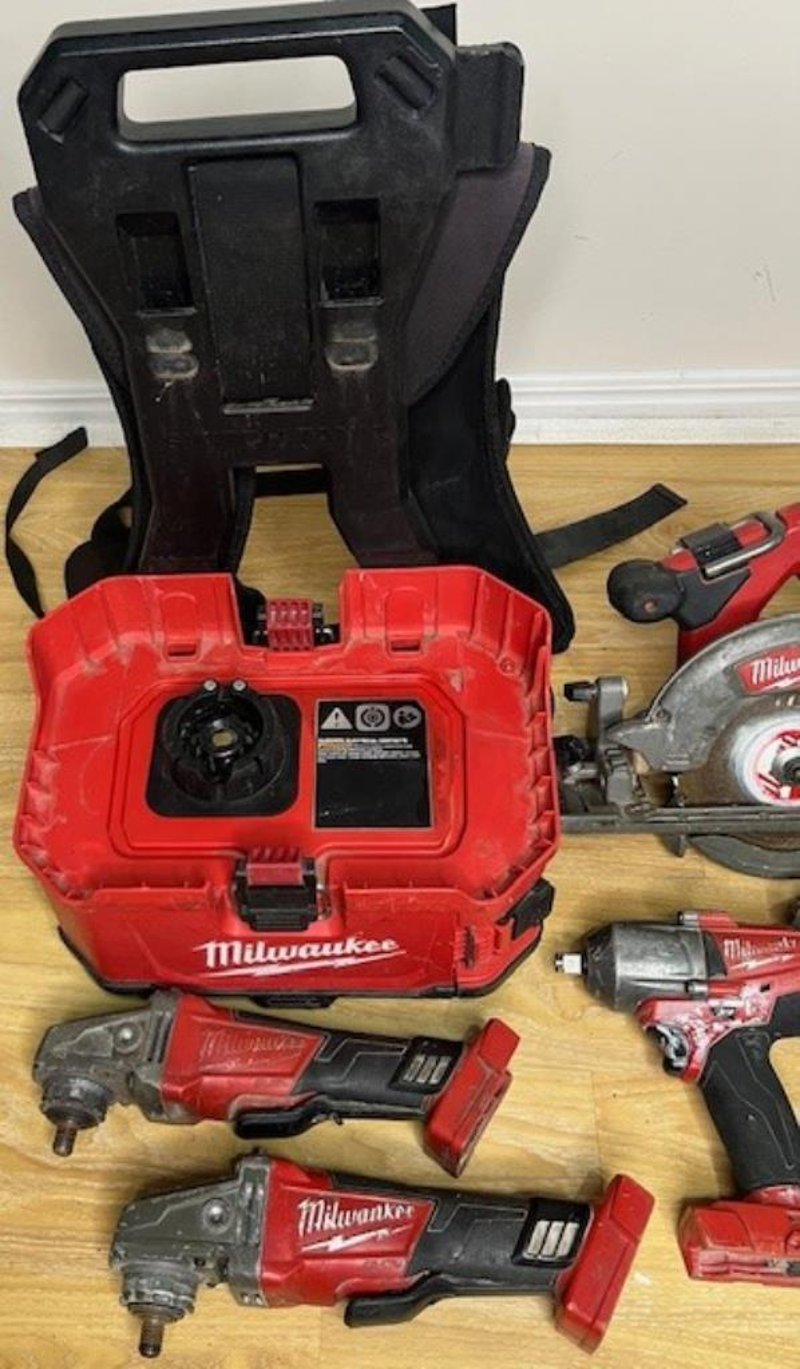 Cordless Milwaukee 18V tools. 2 x M18 CCS55 circular saws, 1 x M18 FHZ reciprocating saw, 1 x HD 18H rotary hammer drill, 1 x M18 5Ah battery, 1 x M18 powered base for backpack sprayer, 2 x CAG125XPD angle grinders, 1 x M18 FMTIWF12 impact wrench. Skins only. Condition: Not working, untested, for parts or repair.
