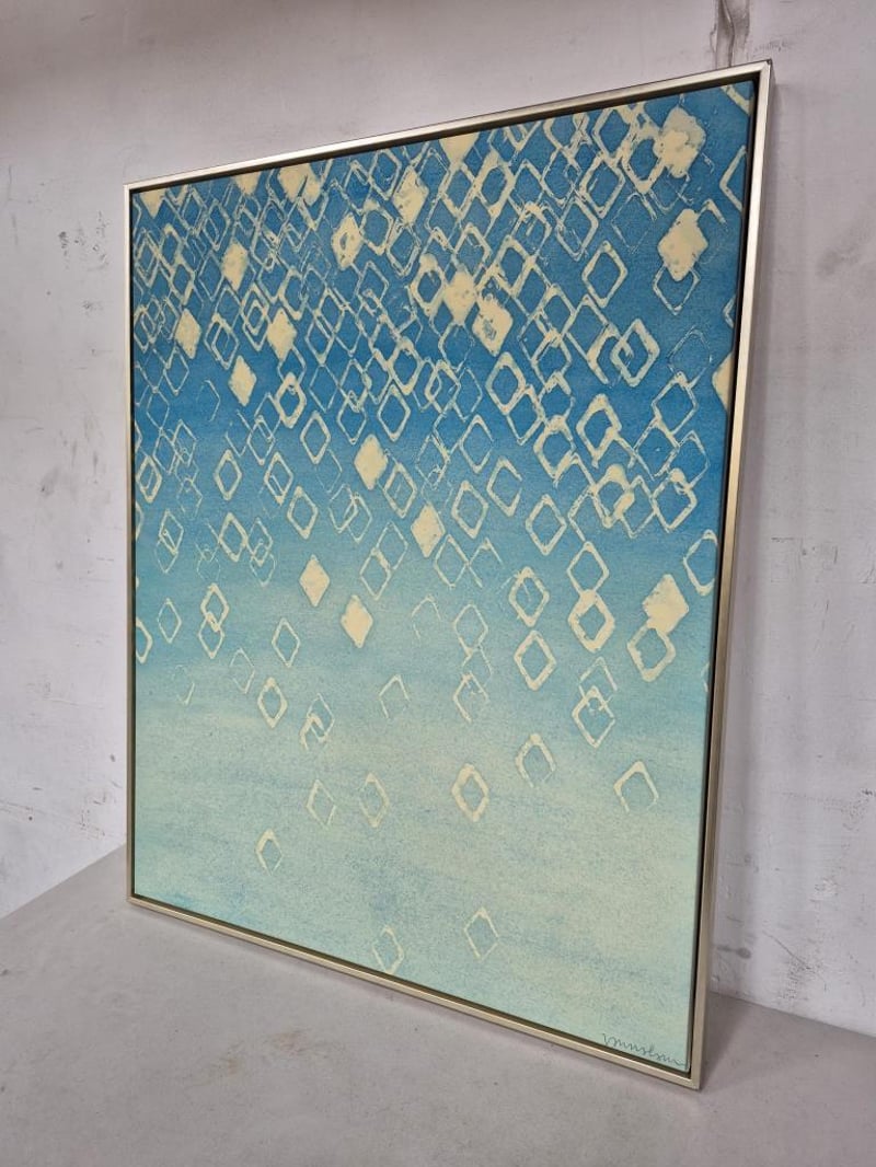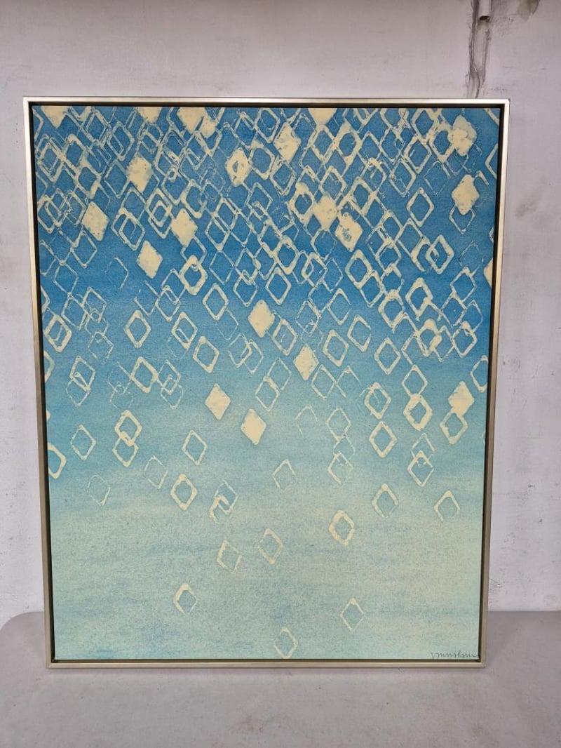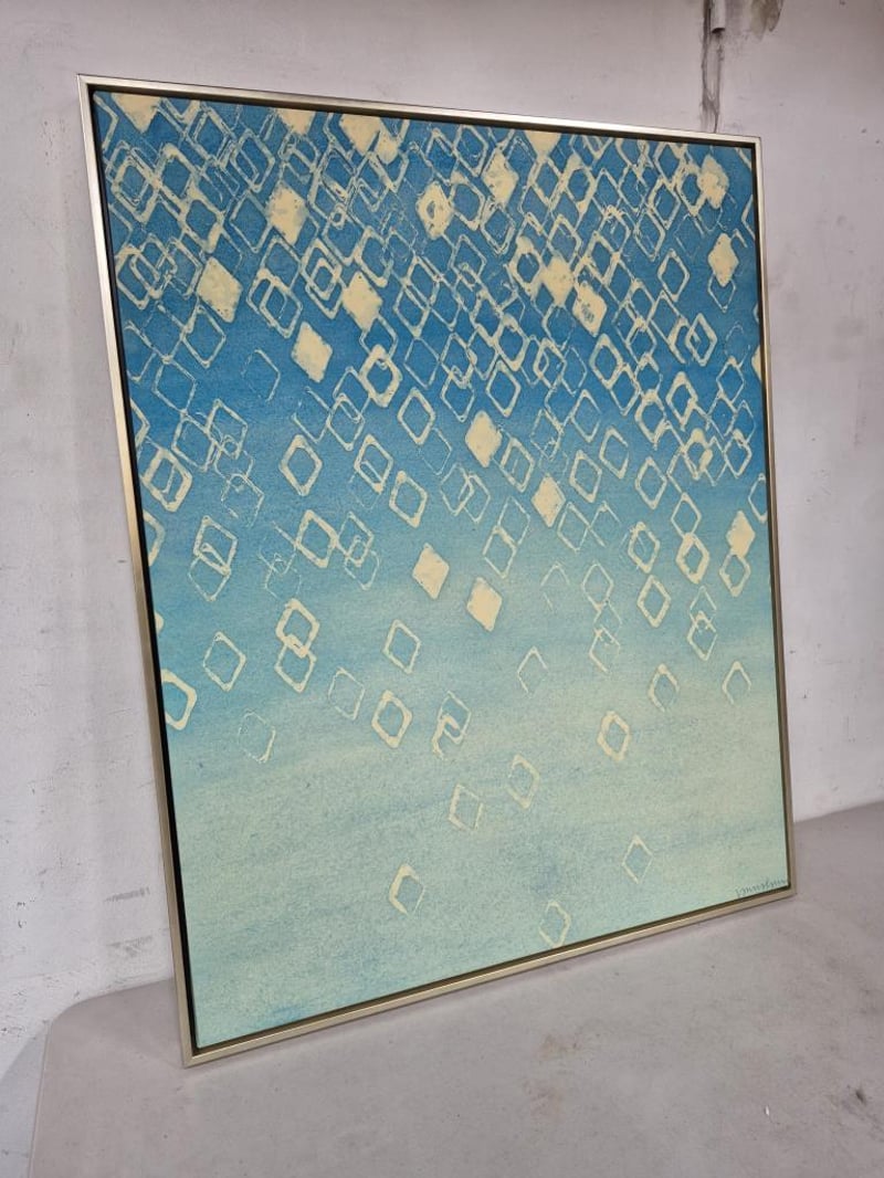 Picture, abstract Square, blue, yellow, Gold coloured Frame,