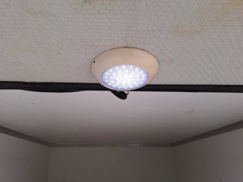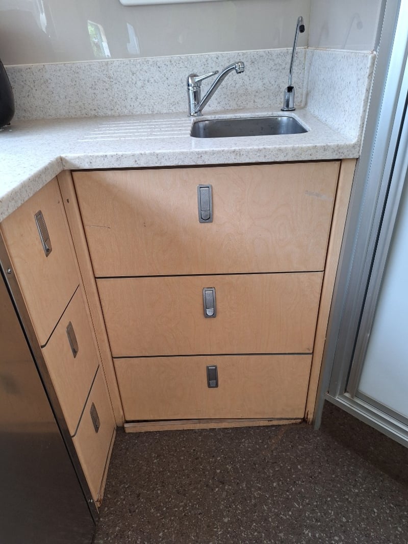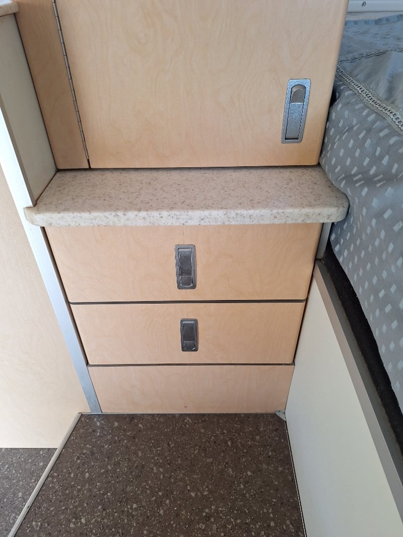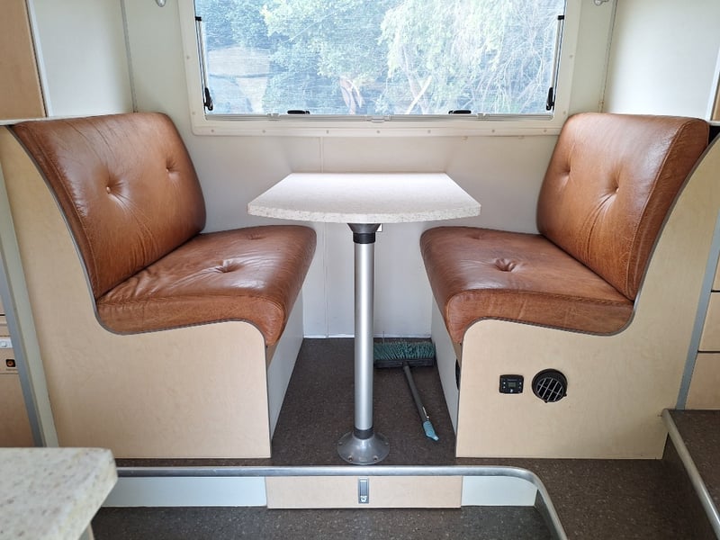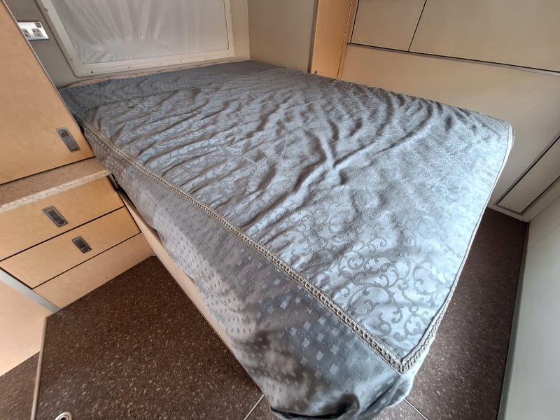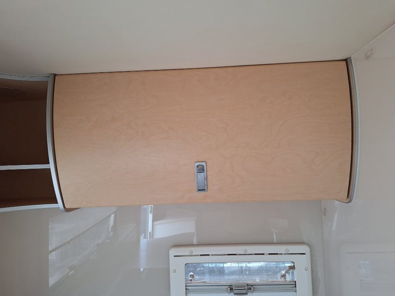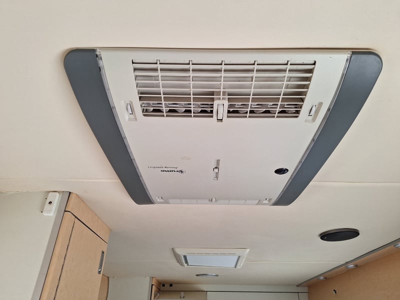 •	Double bed with overhead storage, roof hatches/fans, roof-mounted AC, LED lighting.