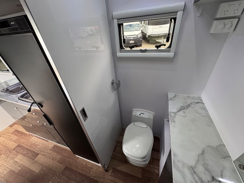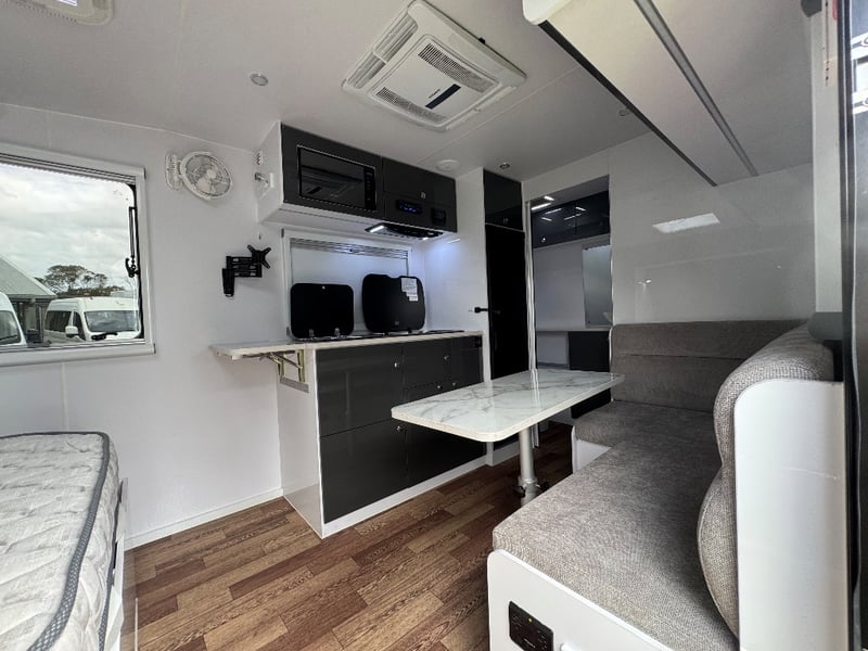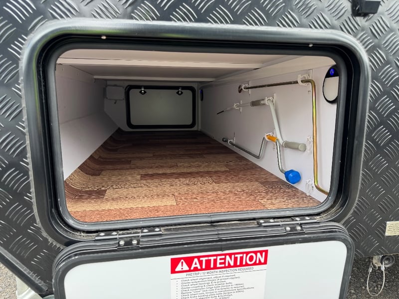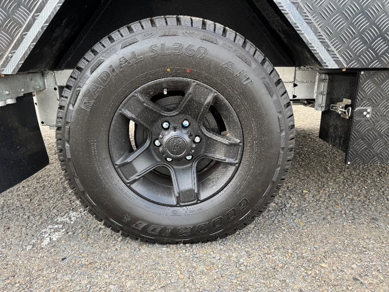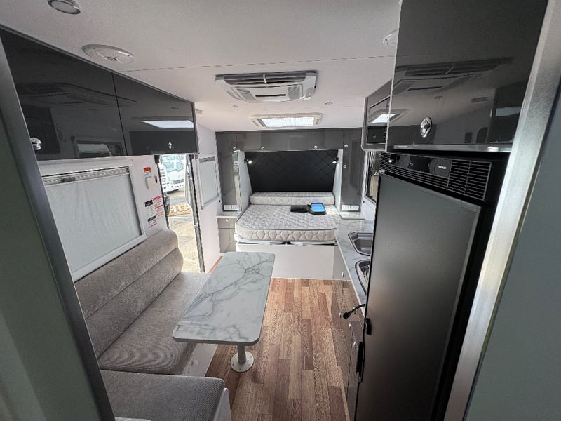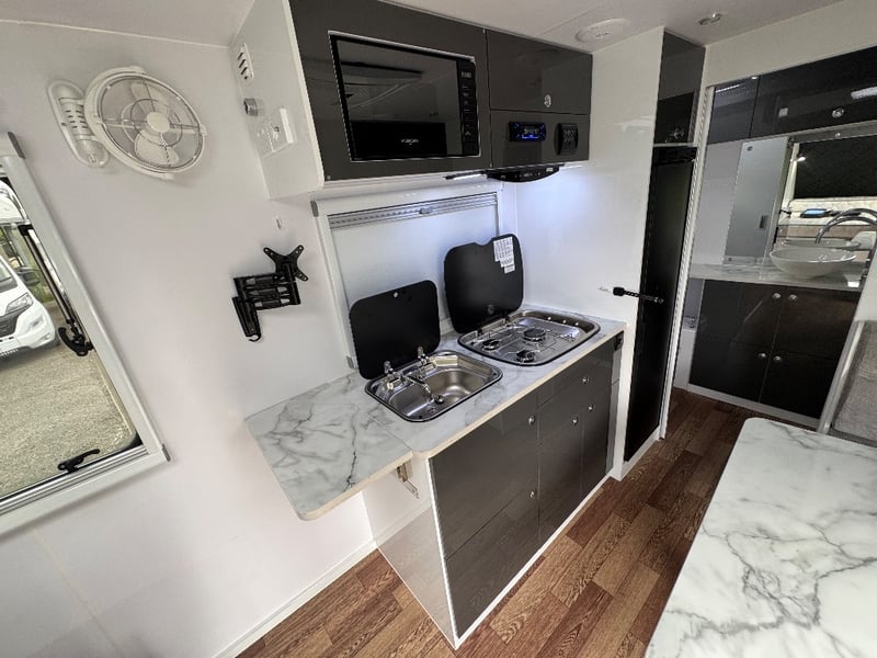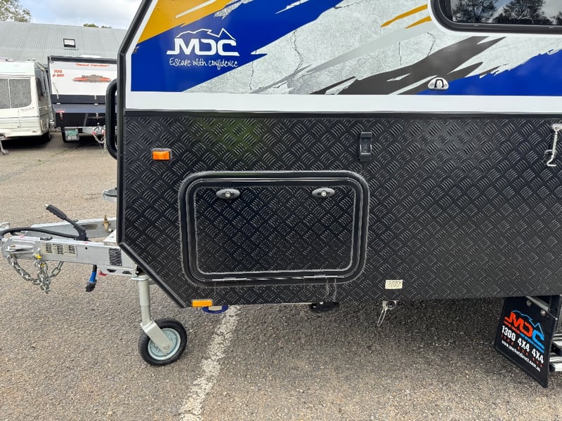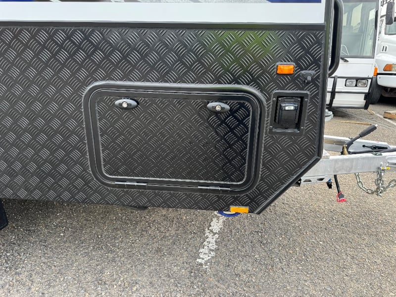 Description: 50mm tow bal hitch, hand brake, 12 pin flat adapter, 2x LPG bottle holders, jockey wheel, awning, double bed, dining area, kitchenette including sink and tap, running water, 3 burner stove top, microwave, audio system, fridge, bathroom including sink and mixer, toilet, separate shower, air conditioning, plenty of storage, original books and manuals