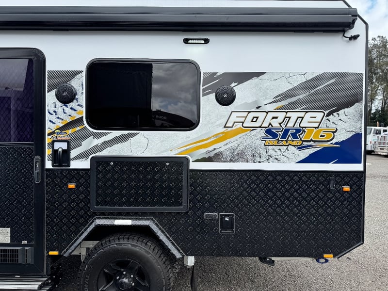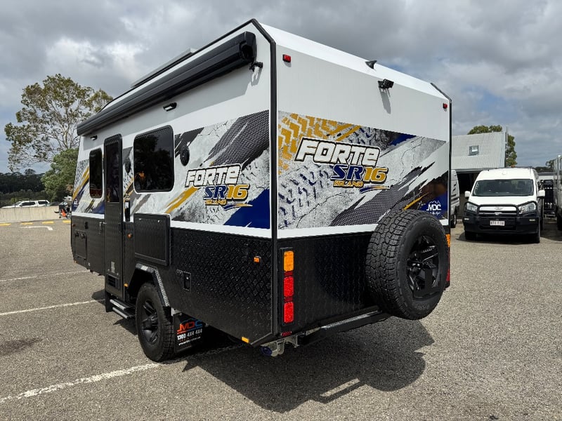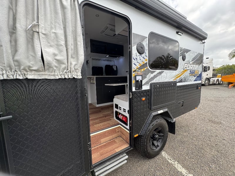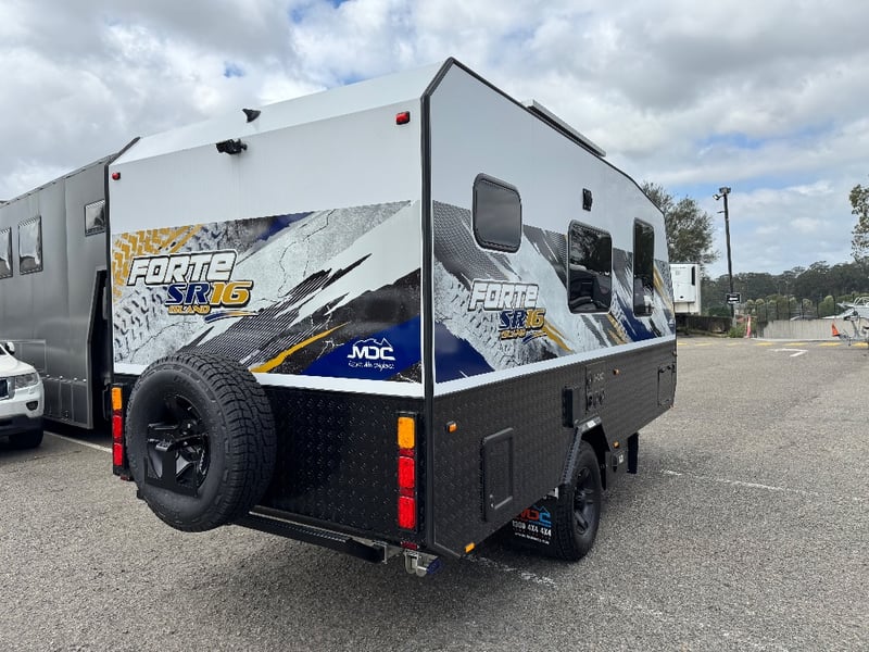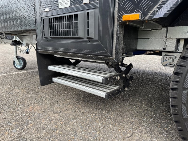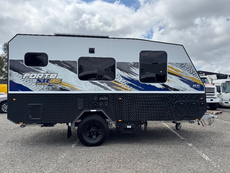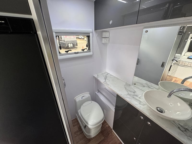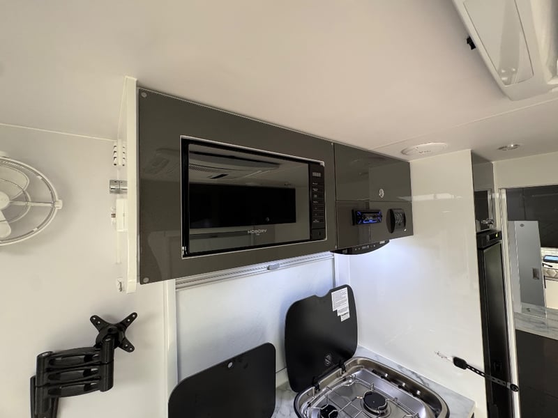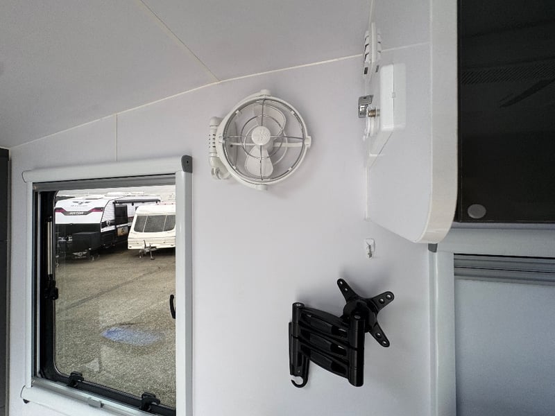 Description: 50mm tow bal hitch, hand brake, 12 pin flat adapter, 2x LPG bottle holders, jockey wheel, awning, double bed, dining area, kitchenette including sink and tap, running water, 3 burner stove top, microwave, audio system, fridge, bathroom including sink and mixer, toilet, separate shower, air conditioning, plenty of storage, original books and manuals