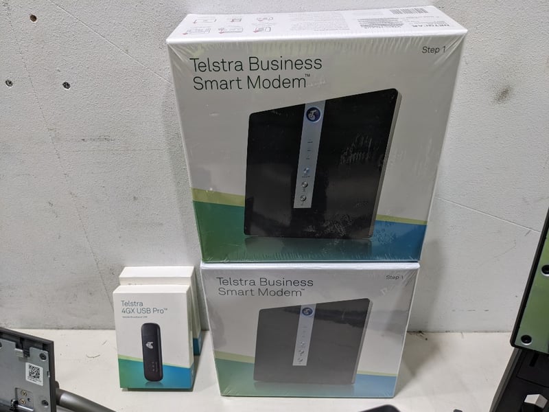 Assorted items includes, Telstra business smart modem, Telstra 4GX USB Pro and more...NOTE: Signs of wear and tear.Sold as a lot.