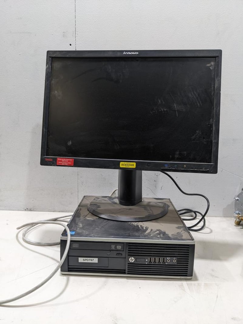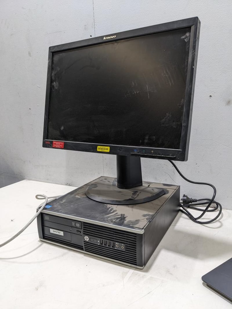 Office items includes, HP Desktop computer and Lenovo monitor mobile. NOTE: Signs of wear and tear, untested Sold as a lot.