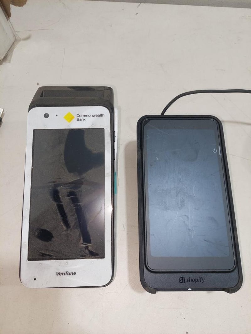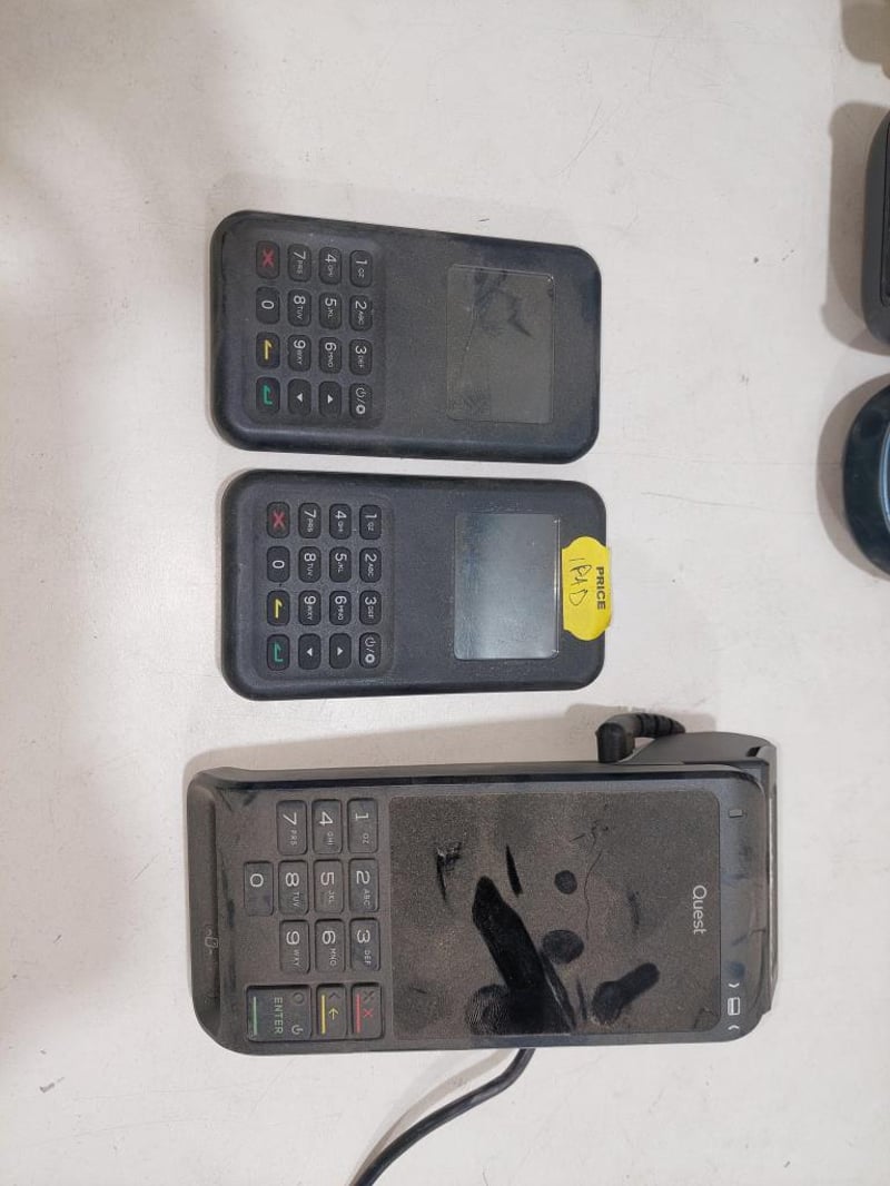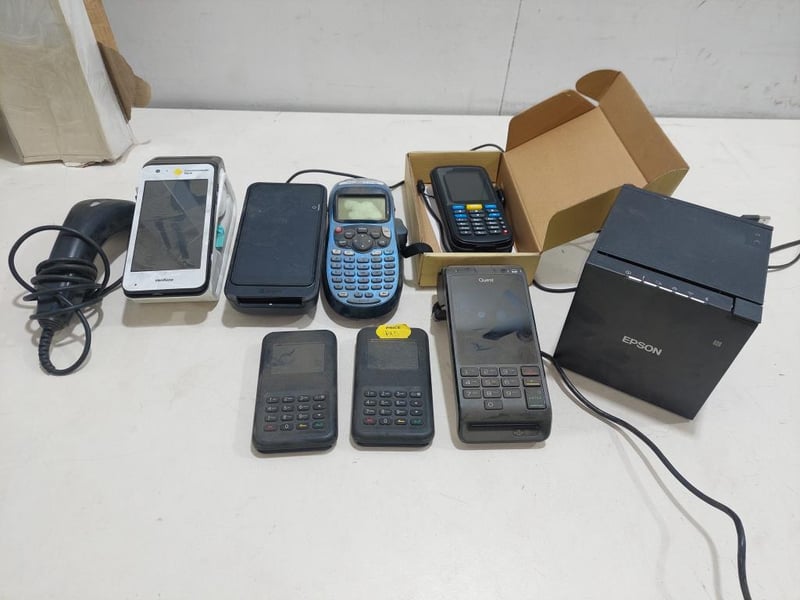 Assorted POS devices along with a barcode data collector and a handheld label maker. Sold as a lot. Note: items are untested.