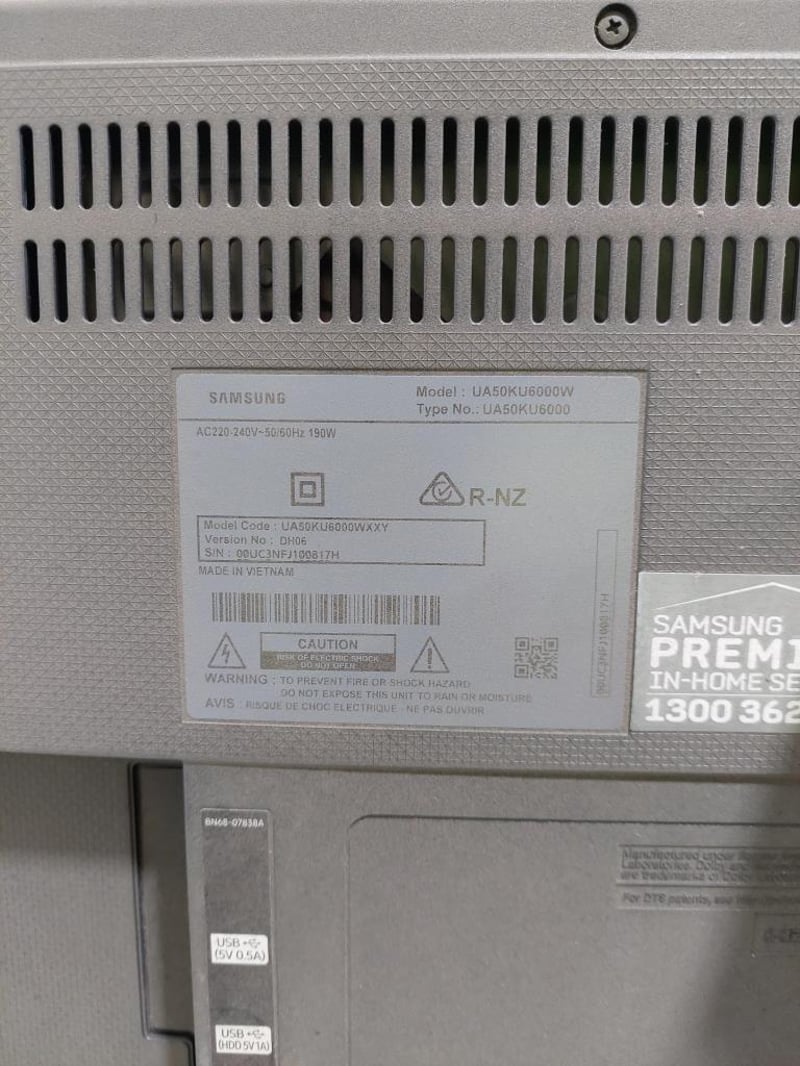Samsung 50inch television.Model: UA50KU6000WSerial number: 00UC3NFJ100817HDims:112.5cm x 65cm x 5cmNote: item is untested.