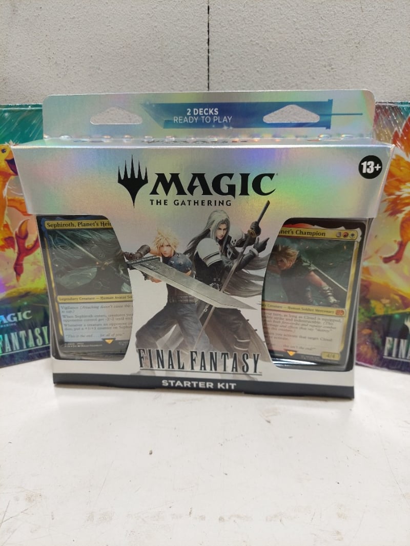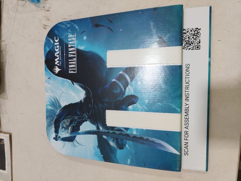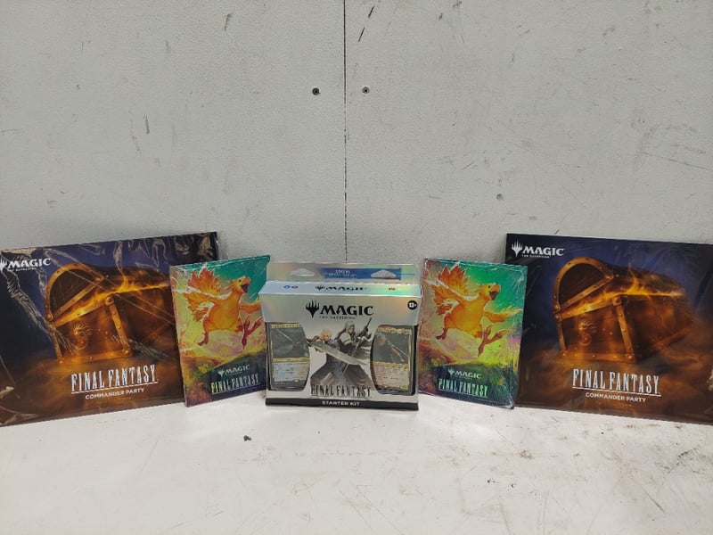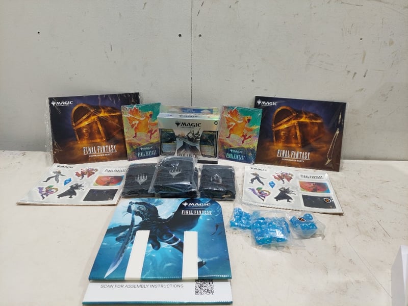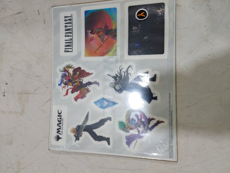 Assorted Magic the gathering final fantasy cards, dice, stickers and more Sold as a lot.