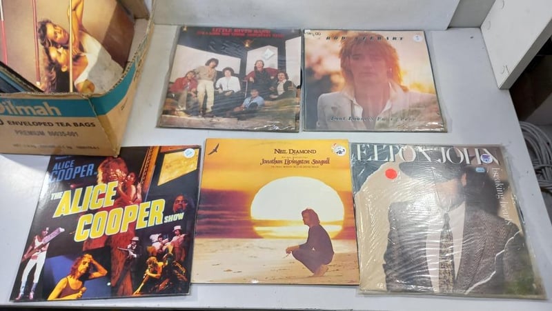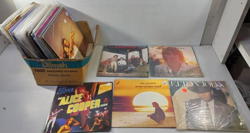 Vinyls, assortment of vinyls Including, Alice Cooper, Elton John, Neil Diamond, Rod Stewart, Little River Band and more Sold as lot