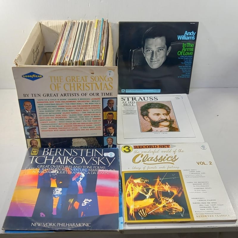 Vinyls, assortment of vinyls Including, Andy Williams, Strauss, The Great Songs of Christmas, Wonderful world of the Classics, and more