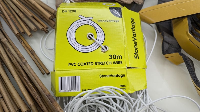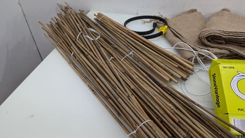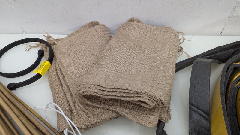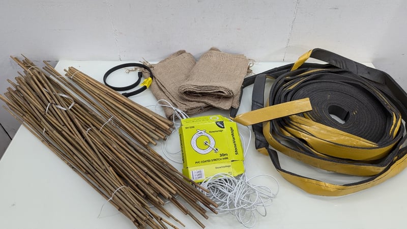 Assorted Bundle, Includes PVC Coated Stretch Wire, Hessian Bags, Bamboo Stakes andore, Quantity Per Lot Sold As Lot
