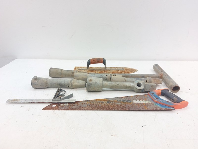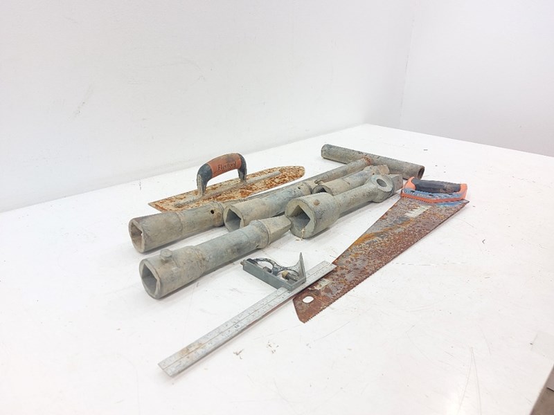 Assorted Tools, Saw, Adjustable Right Angle Square,Concrete Float, And More, Quantity 7 Dimensions 70cm(H) Sold As Lot