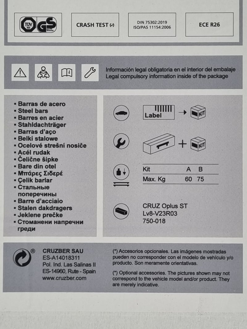 Cruz Oplus ST Roof Racks, Model ECE R26 Dimensions 120cmL x 10cmW x 20cmD