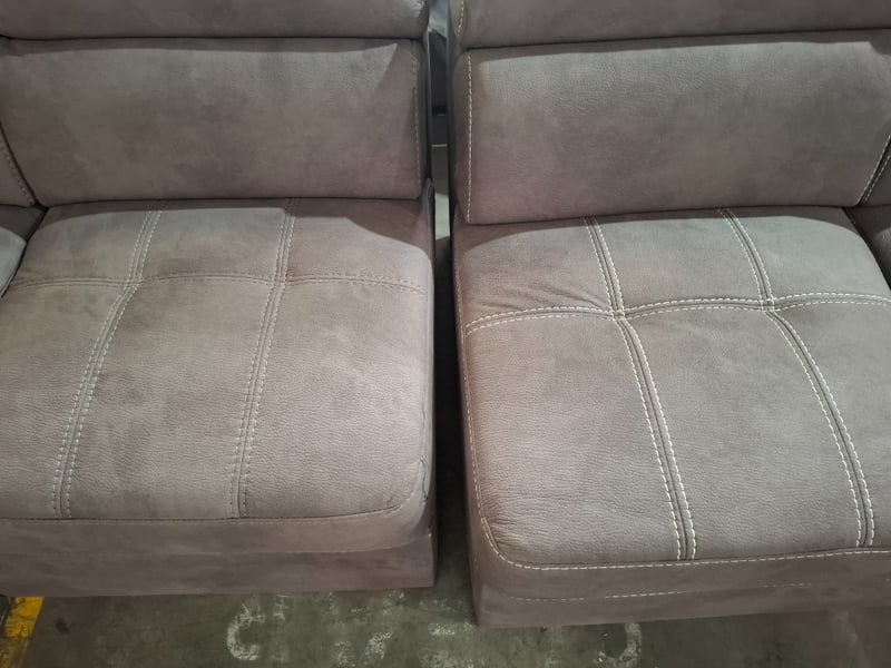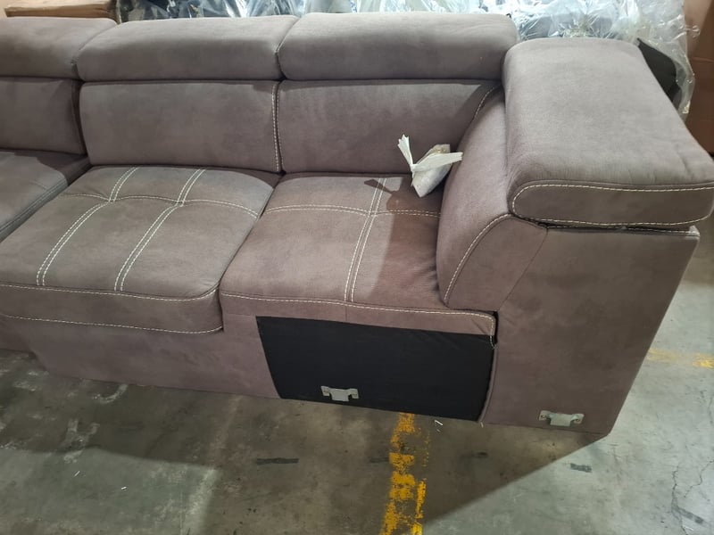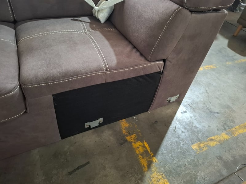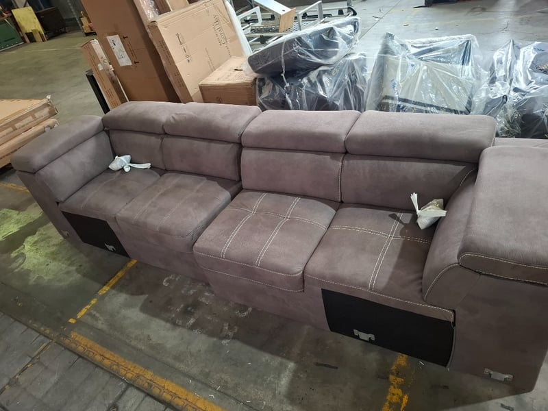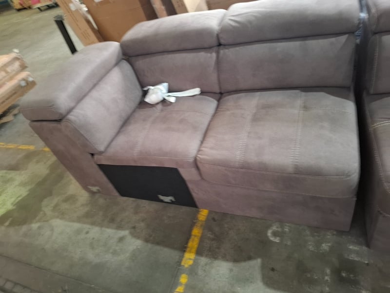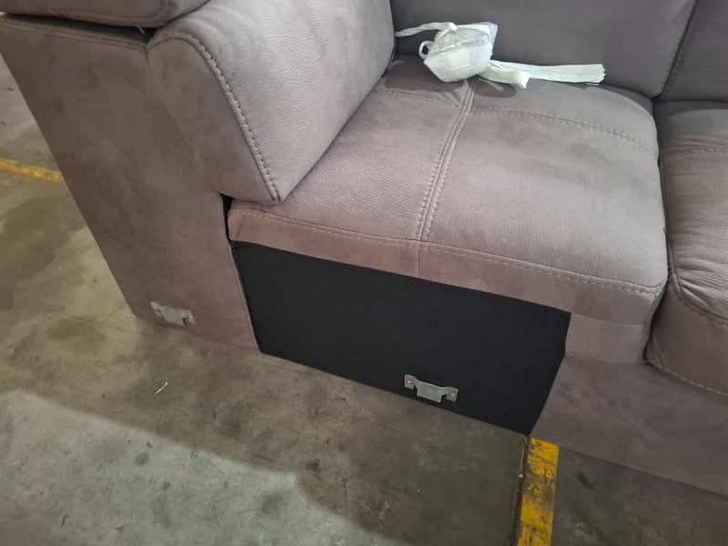 4 seater couch, fabric upholstery, Mushroom,Dimensions: 330cm( W) x 95cm(D) x. 76cm ( H)NOTE: MINOR CLEBAING REQUIRED, INSPECTION RECOMMENDED, WORKING CONDITIONS UNKNOWN, LEGS UNATTACHED