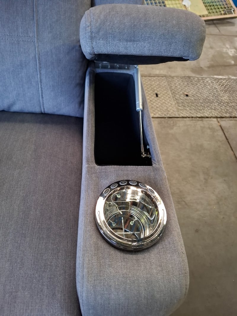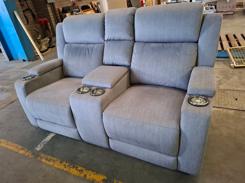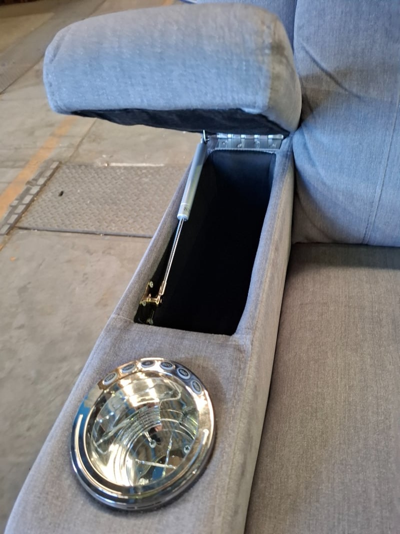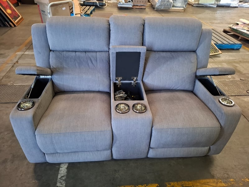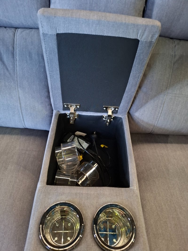 2 electric recliner, fabric grey , 4 cup holders, 3 gas lift storage compartment, led light Dimensions: 172 cm ( W) x 100 cm ( D) x 110cm( H)NOTE:MINOR USE